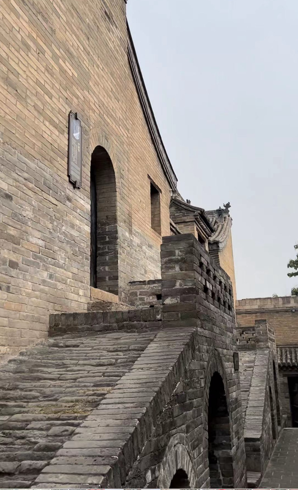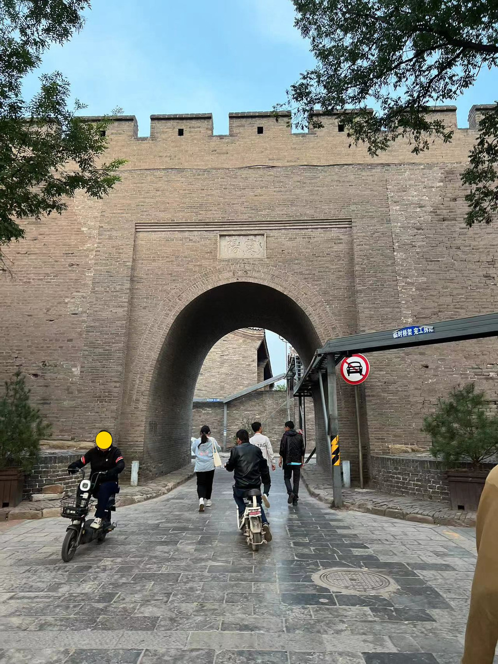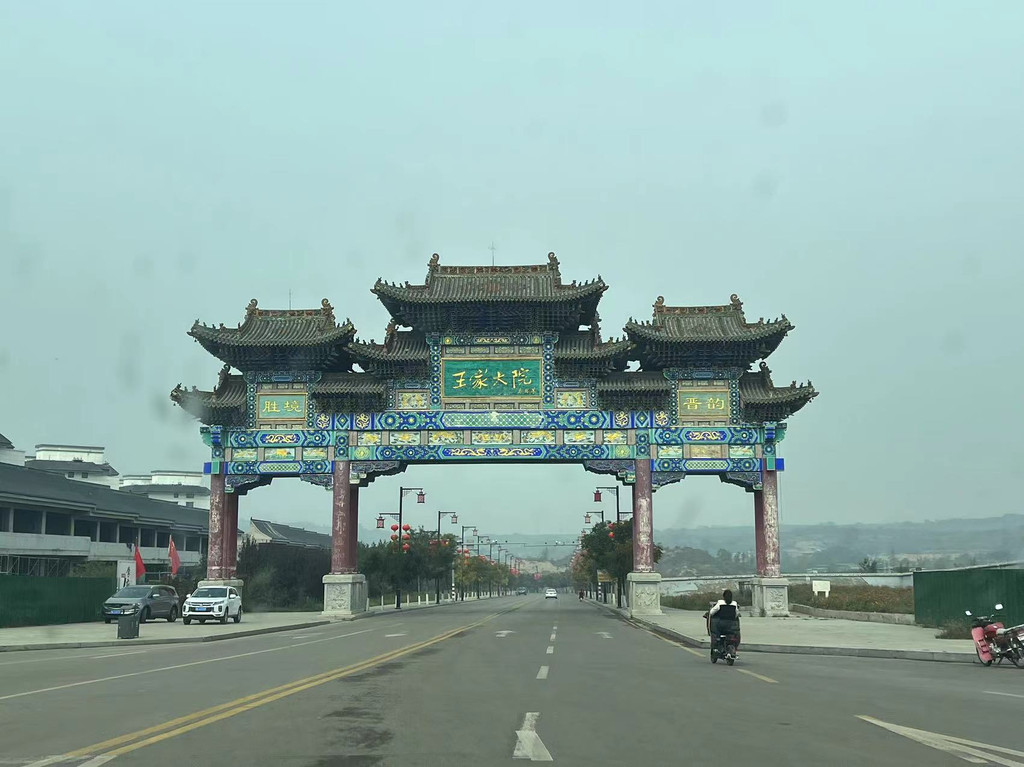 早07:30退房,将行李放在车上,到街上找地方吃早点。08:00开车出发,前往晋中市灵石县王家大院。10:20到达景区外的牌坊。