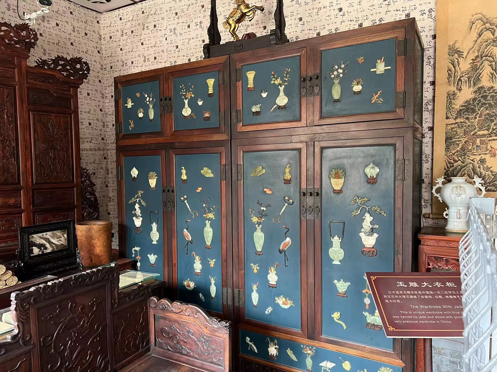 玉雕大衣柜。红木蓝底衣柜是中国独一无二的罕见之品。柜面采用玉石和大理石镶嵌了如意钩、仙鹤、桃榴佛手等吉祥图案,极为珍贵。