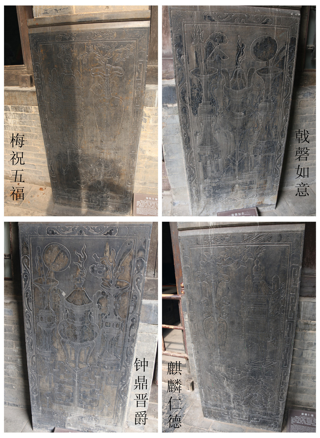 墙基石主体造型为一鼎二觚。觚内插有戟,戟是商周时期的兵器,后来成为官宦人家门前设立的仪仗,是官阶高低的象征;如意上挂有磬,磬是古代一种打击乐器,戟与吉同音,磬与庆同音,戟、磬、如意全称“吉庆如意”。觚与孤谐音,三公三孤是辅弼天子的重臣,为官运亨通、飞黄腾达的祝词。