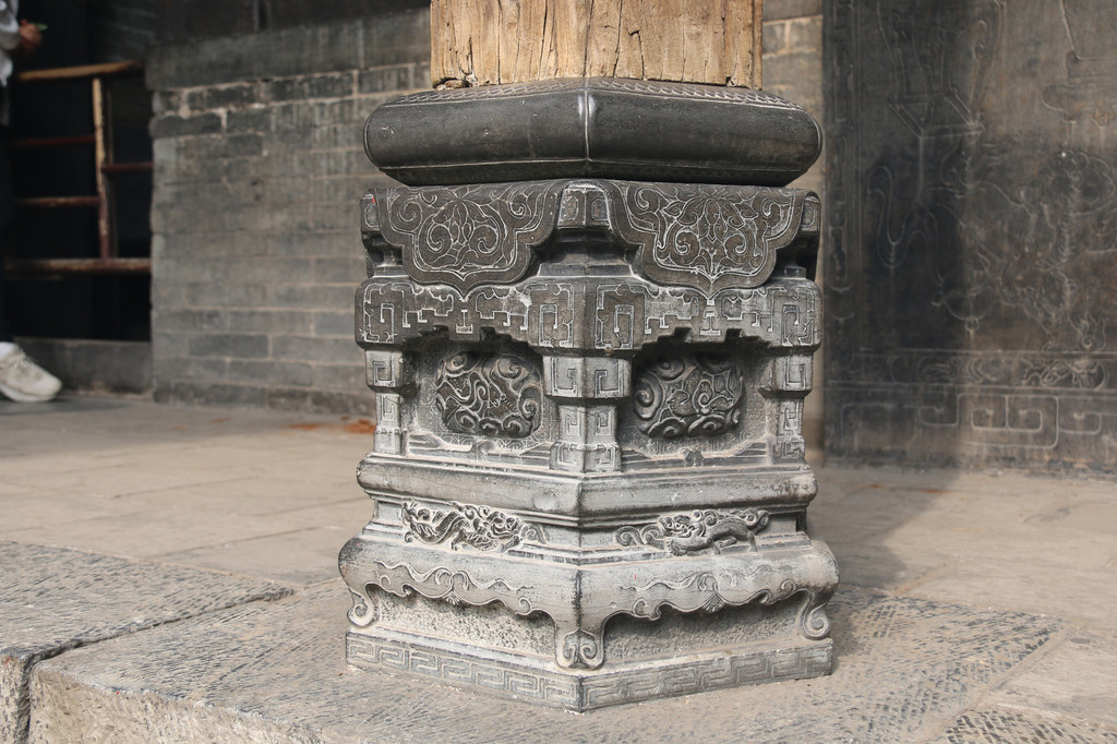 柱础石在建筑中,一是负荷承重,二是防腐防潮,三是审美祝吉。该柱础石分上下六层雕刻,分别为鼓、袱锦、蝙蝠祥云、夔龙、钟鼎底座、回纹。第一层为圆形平鼓状,中间平整,四周倾斜,雨水来时,可以在最短时间内排到下一层,从而实现保护木材不受雨水侵蚀的目的;第二层袱锦,寓意前程似锦。呈倒三角形,由上垂直落下,雨水到达这一层时,同样快速排到下一层;剩余几层同样有排水防潮的作用。第三层蝙蝠祥云,寓意福气;第四层夔龙,辟邪;第五层钟鼎底座,寓意家业稳固,底座为方形,与第一次对应,天圆地方;最下面回纹不断,寓意福气不断。