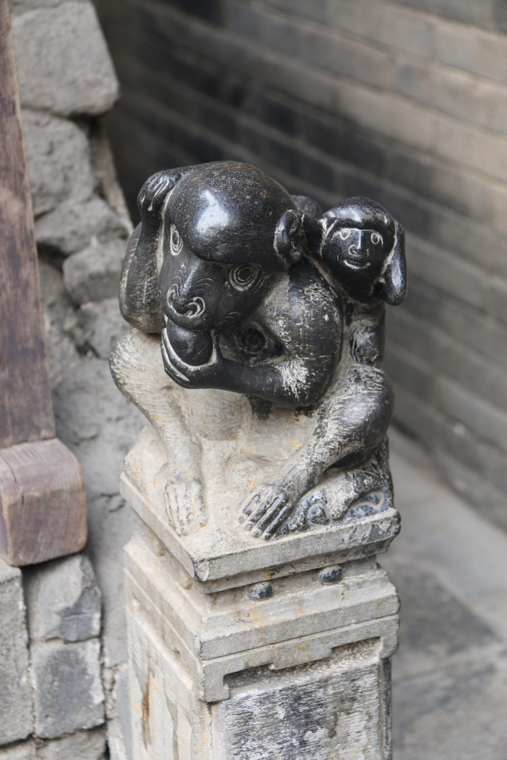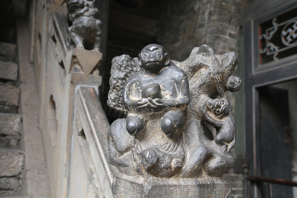 望柱上的石雕,一只大猴背着蜂窝,蜂窝下挂着小猴,地面上有影子,谐音“封侯挂印”。