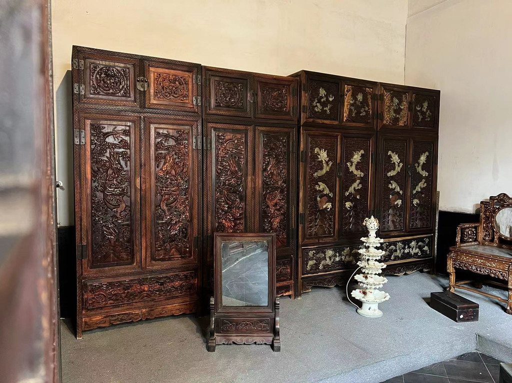 镇馆之宝(一)九龙柜:紫檀木精品木质大衣柜,三面高浮雕、浅浮雕有九十九条龙,亦称九龙柜。紫檀木属于热带植物,主要产于印度及马来西亚半岛、菲律宾等地,是世界第一等木质,寸檀寸金、十檀九空,木质细腻,致密坚硬,入水即沉,明清两朝倍受皇家珍视,不惜重金集天下之能工巧匠打造家具、饰物。