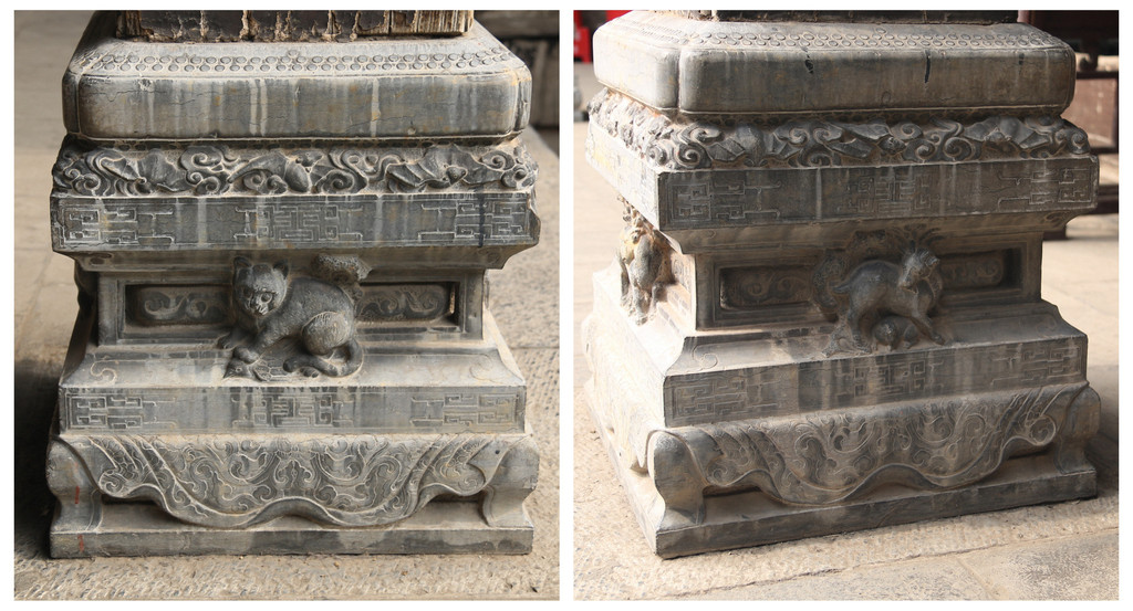 柱础四面雕刻不同的动物。