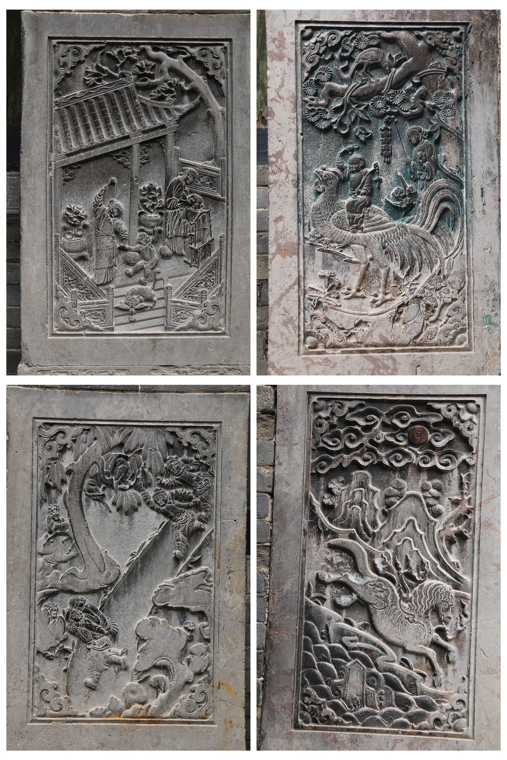 麒麟送子,麒麟为瑞兽,象征祥瑞。图中一童子骑在麒麟背上,后有送子婆婆,祈盼家族子嗣贤德。(下图右下)