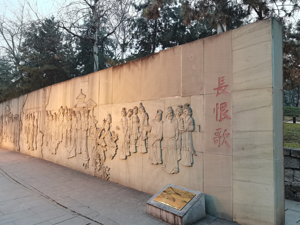 沿着步道往南前行,路右侧立有数米长的《长恨歌》人物浮雕图,只见人物画像饱满,情态各异,栩栩如生。前行到南端后,即可见景区内的地标建筑:阅江楼。阅江楼高四层,是一处典型的仿古建筑。整个建筑气势恢宏,雄伟壮丽,颇具汉唐遗风。