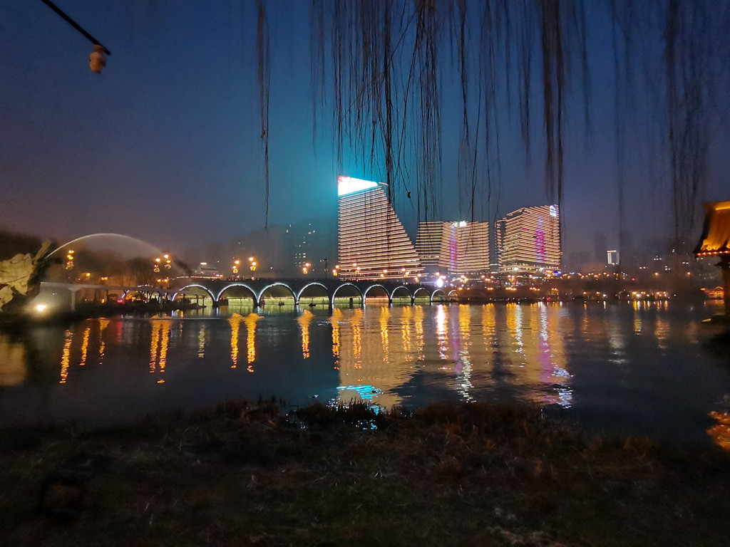 过阅江楼后,就到了景区的东侧,折而向北。此时,夜幕开始降临,华灯初上,只见水面上灯光点点。离景区不远处,摩天大楼鳞次栉比,霓虹灯交相辉映;现代与古典在此碰撞和交融。前行片刻,只见一座华丽壮观的十一拱桥矗立在水面上,桥上灯火璀璨,流光溢彩。桥名曰:黄渠桥。唐代时,玄宗李隆基修成黄渠,从而使曲江池的水面达到最大,成就了曲江池历史上最繁荣的时刻,故称黄渠桥。