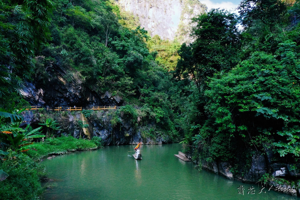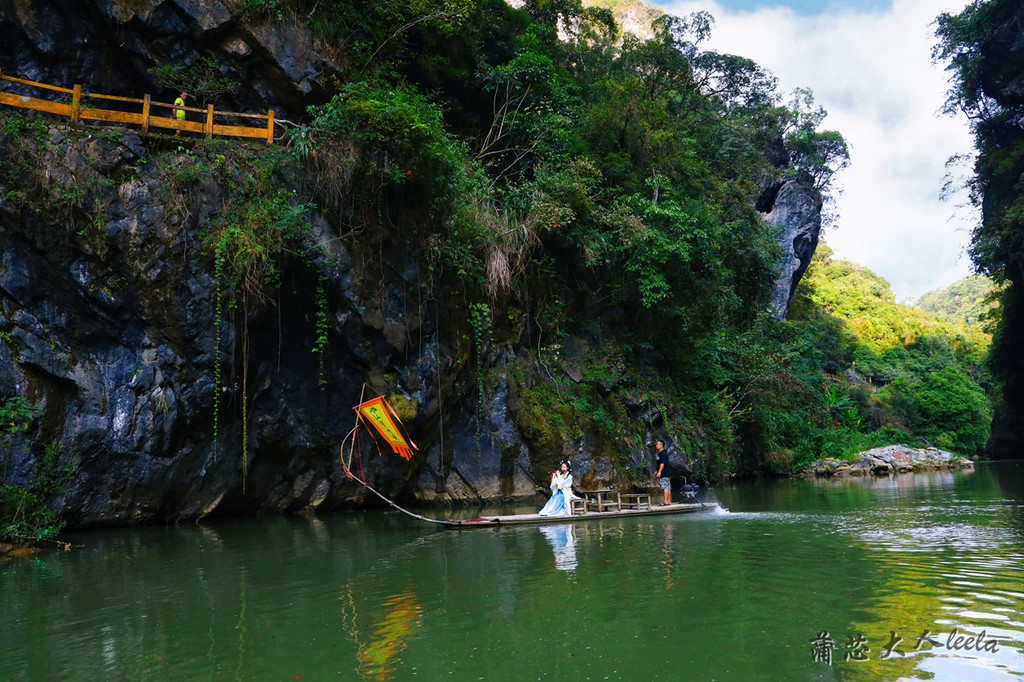 悬崖栈道是在悬崖峭壁凿出的路,不时有泉水滴下来,沿途风光无限,悬崖上草木芳荣,蝉鸟鸣叫,还能看到开往情侣峡的竹筏。