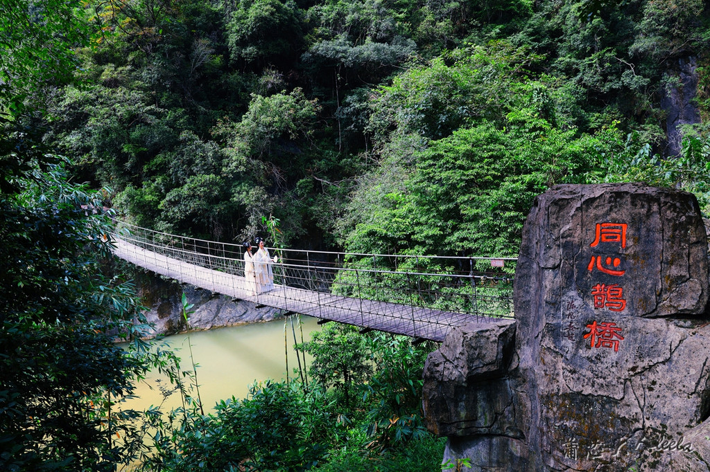 去仙门有两条路,一条是水路,坐竹筏到码头上岸,再走石阶到仙门;另一条是悬崖栈道,走到同心鹊桥时,可以过桥上山到仙门,直接往前走就是仙门奇瀑。