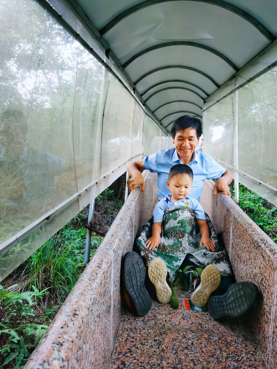 我们费尽九牛二虎之力走到元妙道观,下山时过段选择仙门滑道,这条666多米的滑道是广东第一长滑道。我门从灵霄宝殿旁开始,一直滑到仙门门口,有可能是我体重超标,所以很快就滑下来了,先生和宝宝就卡在滑道上,要用手推着往下滑,哈哈哈!