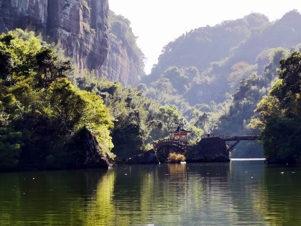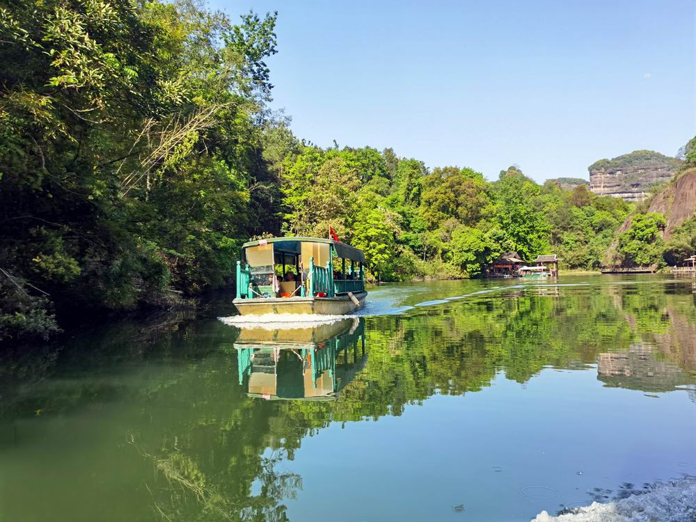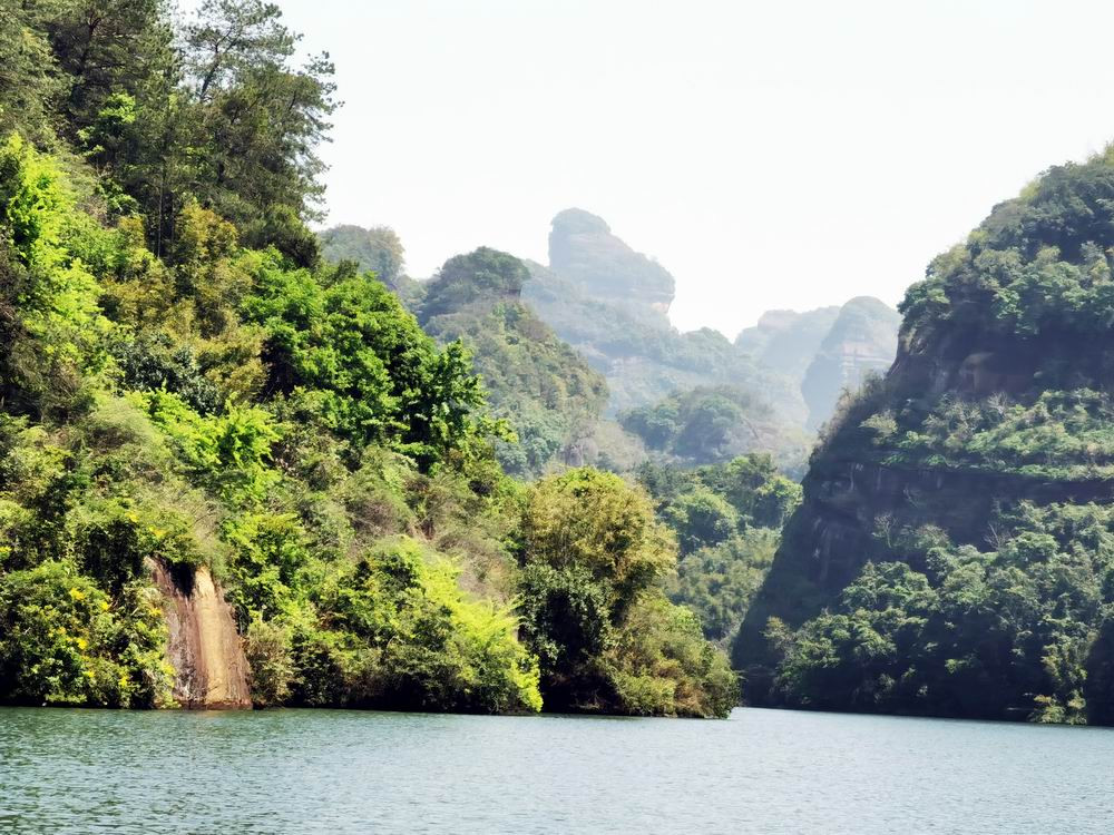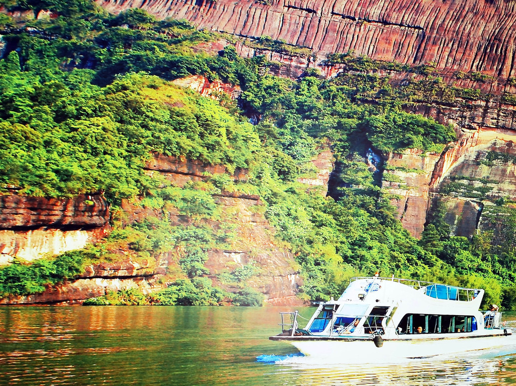 水上丹霞风光如画,岸边不时闪现亭台楼阁。
