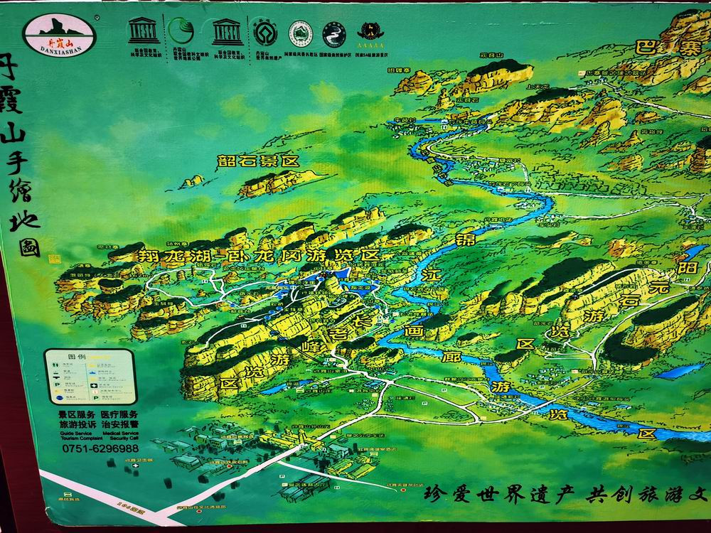 丹霞山有岭南第-名山之称,方圆200多平方公里的红色山群如一株丹云,似一片霞光,古人形容其“色如渥丹,灿若明霞”,故而得名丹霞山。它是世界地理学上“丹霞地貌”的命名地。图为丹霞山的手绘地图。