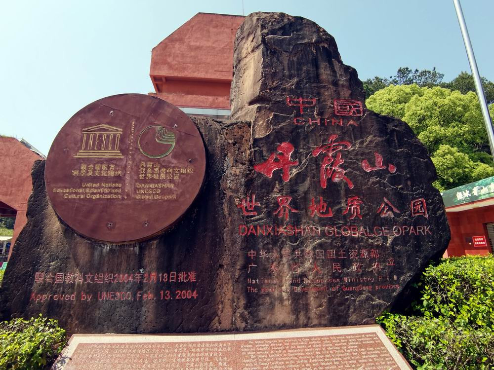 地质学家研究:在世界已发现的1200多处丹霞地貌中,韶关丹霞山是发育最典型、类型最齐全、造型最丰富的丹霞地貌集中分布区,因此成为世界地质公园和世界自然遗产。图为世界地质公园和世界自然遗产的标志石碑。