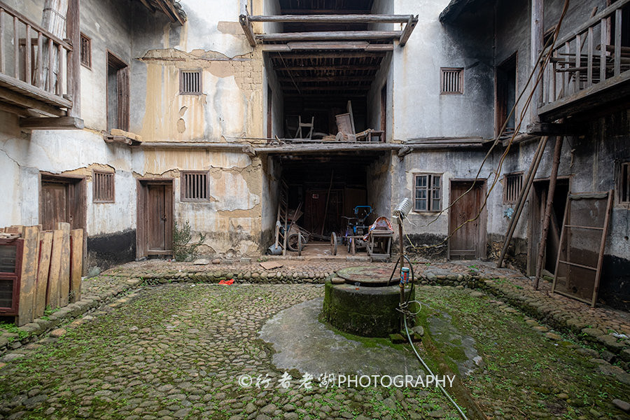 与“沙坝围”一水之隔,还有一座三层小围楼——“西坝围”,青砖镶角,卵石筑至屋顶,也是清朝同期建筑。方形回字结构,高10米,宽20米,占地面积360平方米。在门口踌躇不前之时,遇到了村民华余中,热情让我进去拍照,他说一家人一直居住在这里,直到1980年才搬到边上新房去住了。走进“西坝围”外拱内方的大门,老房屋房间都是木质小门,四处放置着一些旧农具等杂物,围楼中间是四方天井,中央有一口水井,地面是鹅卵石铺成的,青苔掩饰不住岁月的痕迹;二、三楼原有木质檐街和巷道衔接联通,一些木板栏杆都已完全失去,仅剩两三个伸出来的木檐台,彰显着过去的繁华。