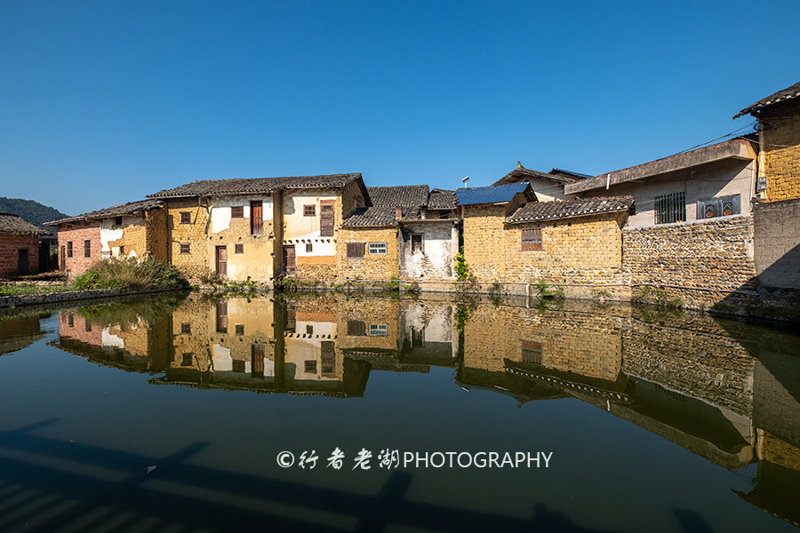 与廖屋村仅隔着一条乡道就是田心村,村中有一个热水塘,水塘里有多处温泉眼,最热泉眼高达80多度,人们叫它温泉村,成了始兴县的网红温泉村。阿龙哥的另一个客栈“沁福园”在罗坝镇田心村的一个围楼里,冯大哥也曾经在田心村租过老屋。村里有不少土砖老房,倒映在热水塘中,颇有点安徽宏村的味道。热水塘正中间有一个很大的公共温泉池,热泉源源不断涌出,一处流入温泉池,村民免费在此泡温泉,游客买票也可以泡。还有泉水分流入洗衣池和劏猪池,即使在寒冷的冬天,村民可以用温泉洗衣服、劏猪,方便又卫生。