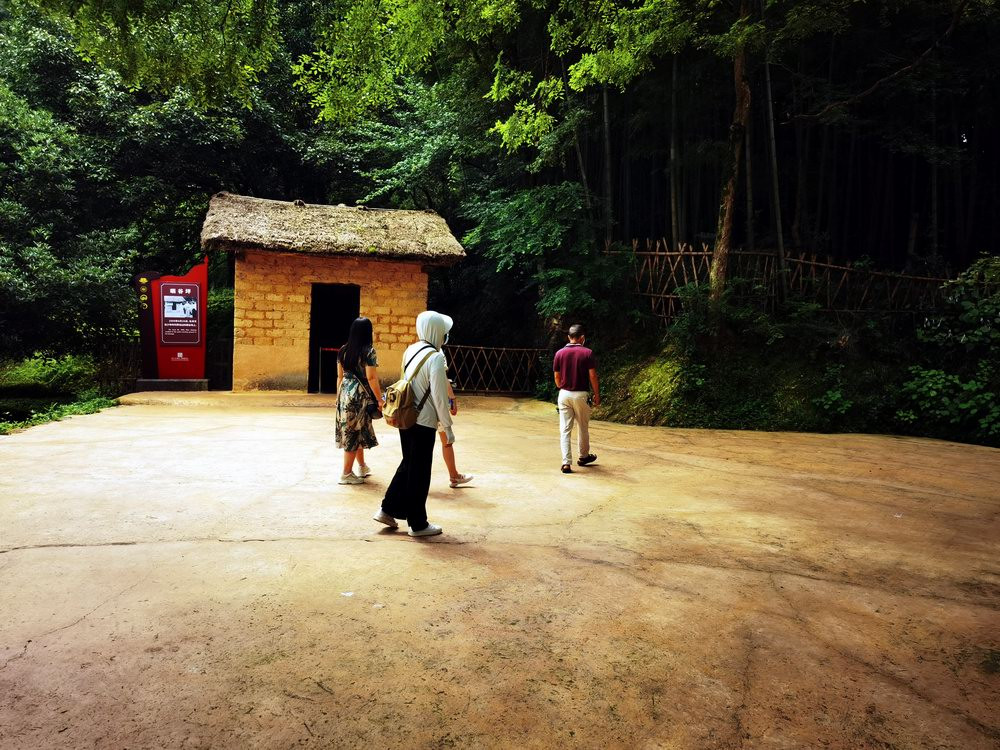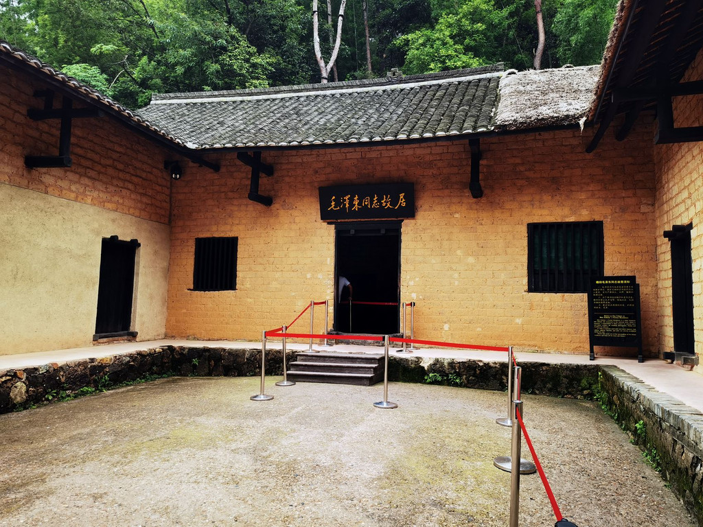 毛泽东故居是一个苍松翠竹环抱的小山冲,冲前是一潭清泉。农舍也是南方常见的,由土坯垒成,背靠青山,前临清泉,景色是相当的好。图为我在这里拍的纪念照。