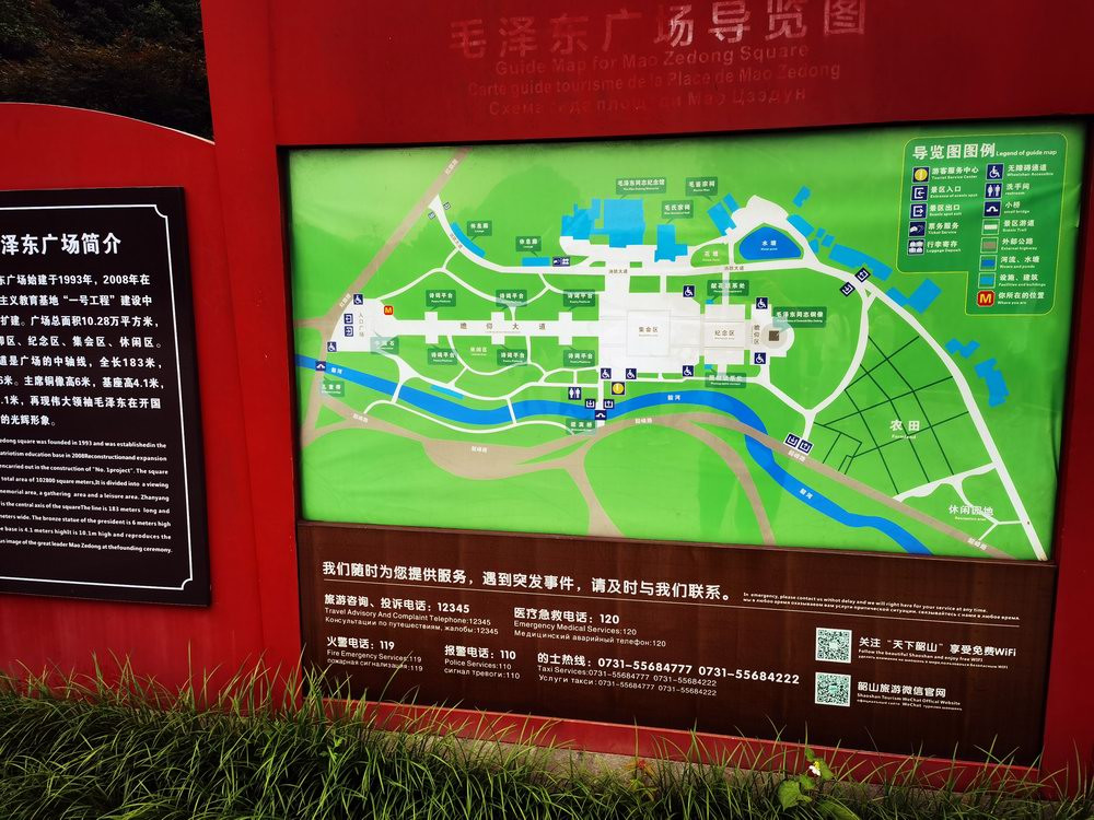 毛主席铜像广场十分雄伟,植有松、柏,而花坛中则植有冬青、山茶、月季等花卉。毛主席铜像广场十分雄伟。图为广场导览图。