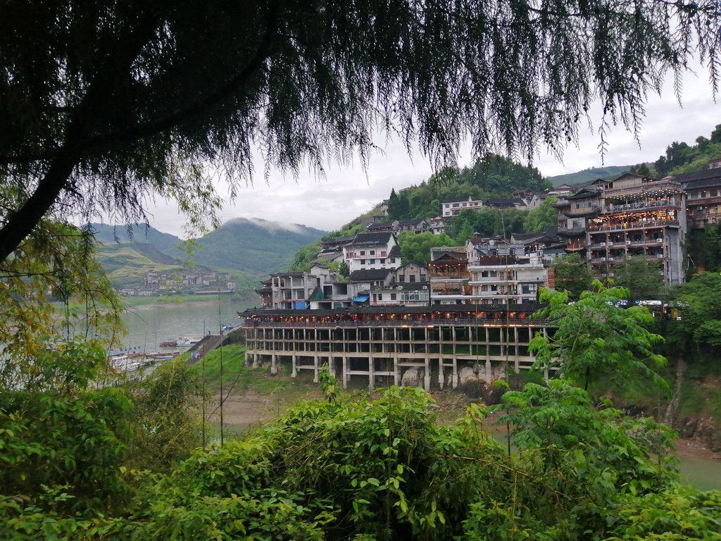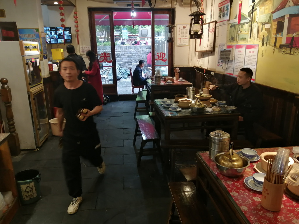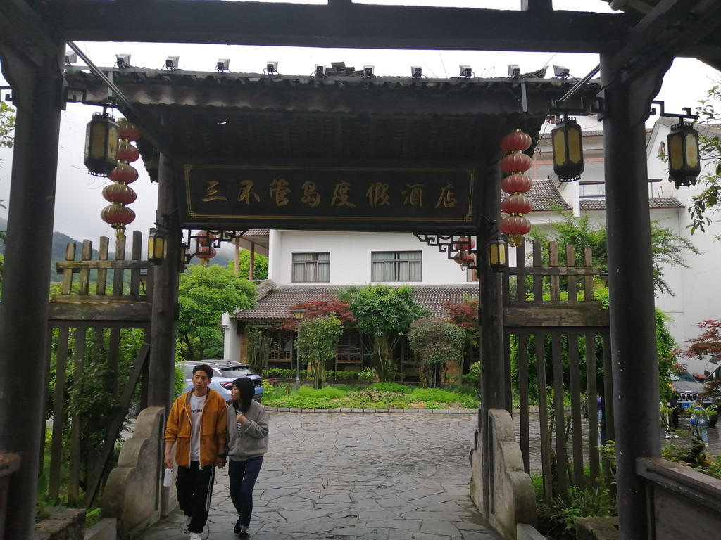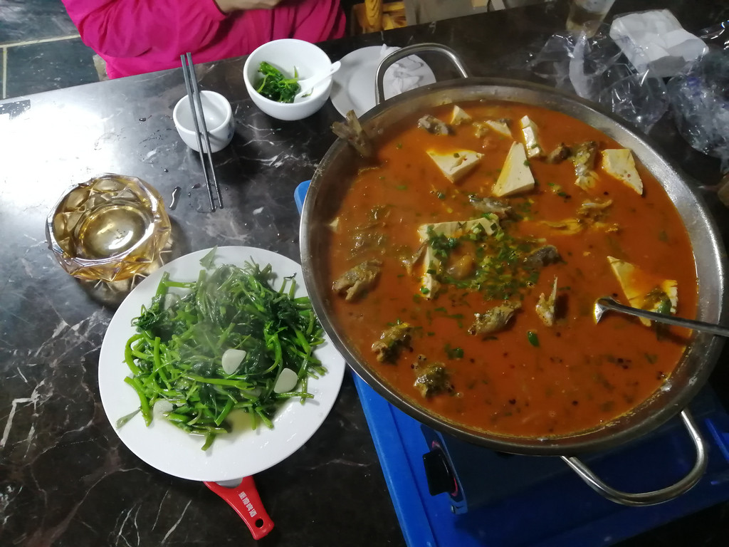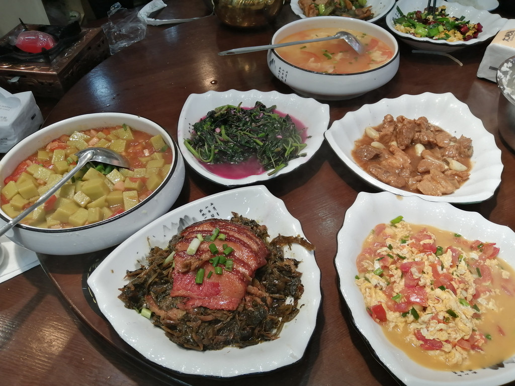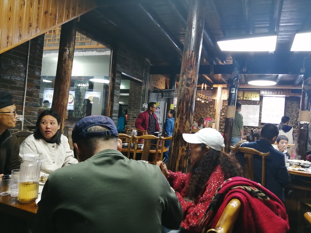 出了景区。在停车场旁边土菜馆吃晚饭。店里坐满人,只能和一对年轻夫妇拼桌。那对小伙子和小姑娘夫妇点了三菜一汤。我们点了土家族扣肉,刘晓庆米豆腐等等,菜的味道不错,只是感觉这里的特色刘晓庆米豆腐一般般。这么几道菜倒也不算贵,加餐具米饭共235块钱。
