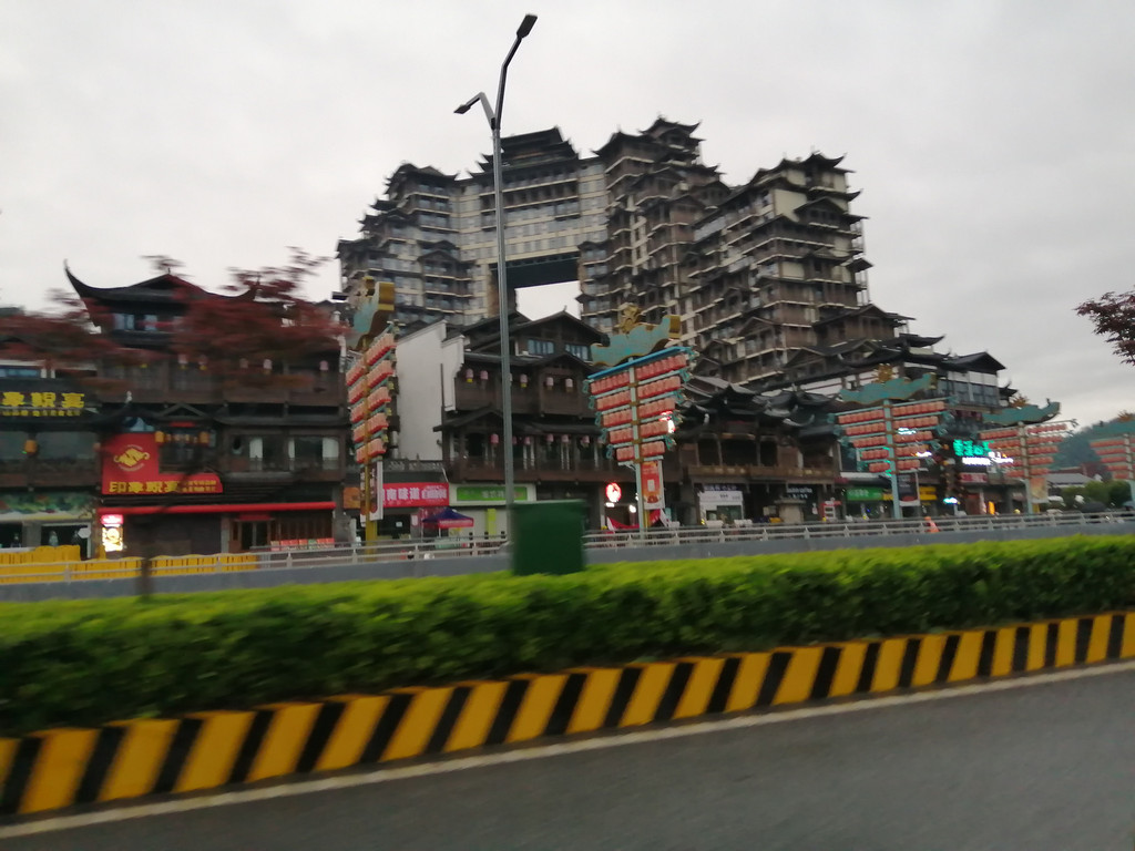 五点起来。吃完早餐,六点出发。市区转入武林源大道就看见七十二奇楼了。这座世界上最高大的仿吊脚楼建筑确实很壮观。十几年前来的时候,这座奇楼还没有。到了晚上这里就热闹了,吃的,玩的这座奇楼里都有。