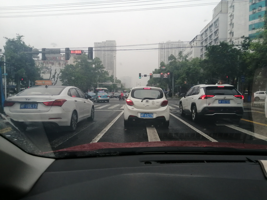 虽然车多拥堵,但好在过了王村大桥左转并道芙蓉路时,三岔路口有交警在雨中现场指挥,两边轮流放行。非常有秩序。