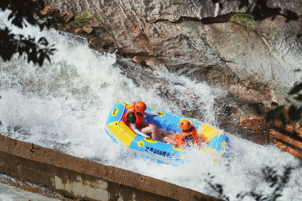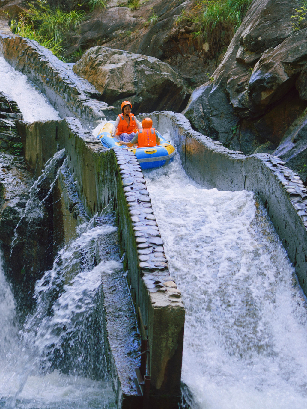 云灵山峡谷漂流,全长5.8公里,总落差219米,体验时长约2h,可谓超长待“机”了。漂道依峡谷走势而建,让我第一次体验到了什么叫真正的原生态漂流体验。漂流河道分为两个漂段,第一段最是刺激,用时约1h。其中有一个落差达29.8米,每个路过此地的勇者都会惊叫连连,握好把手,蹬好脚,绝对体验得到水上云霄飞车的刺激!还拥有全国独一无二的“一条河道,两条滑道”的创新设计;第二段相对平缓一些,偶有转弯,高低落差,老少皆宜。