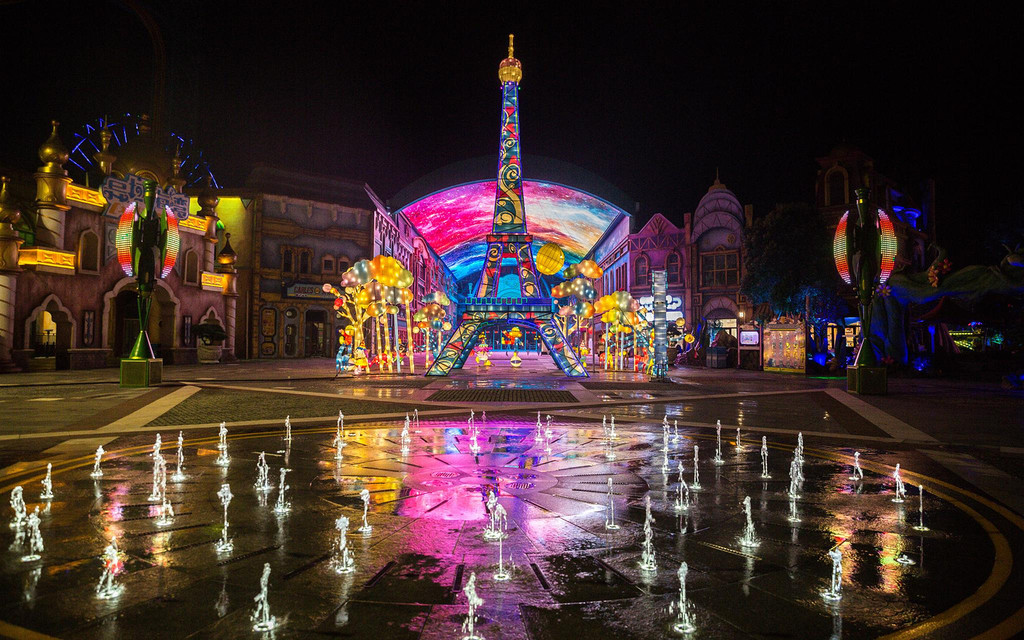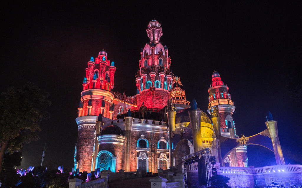 到了晚上,这里就化身为璀璨星光的浪漫城堡,比白日多了几分绚烂,既然来到了酷玩王国,那当然要看上一场endding灯光秀才算完美!