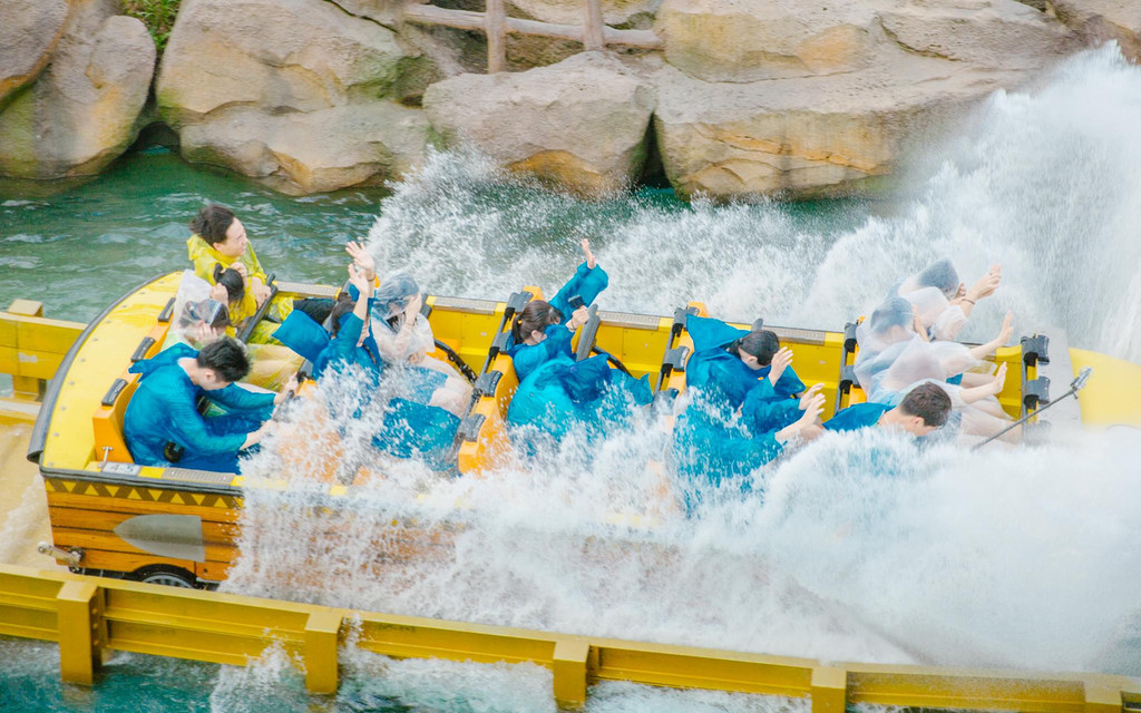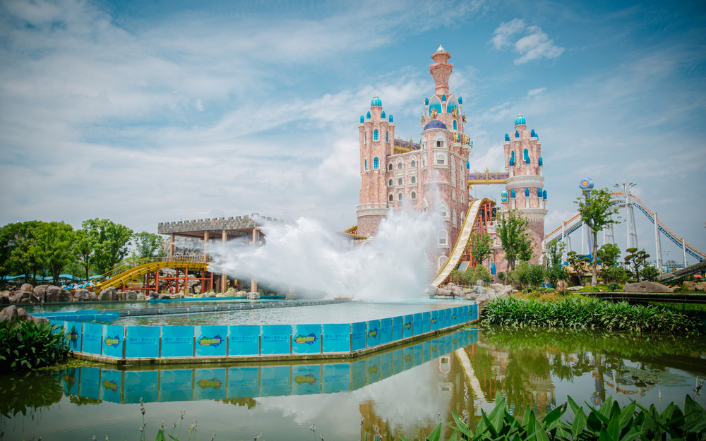 你可以乘坐飞舟冲浪围绕着城堡,在一个猝不及防的瞬间俯冲而下,激起层层叠叠、壮阔完美的水花,体验专属于夏日的透心凉。