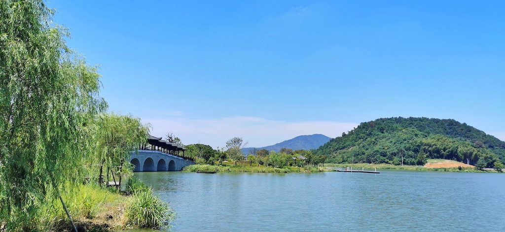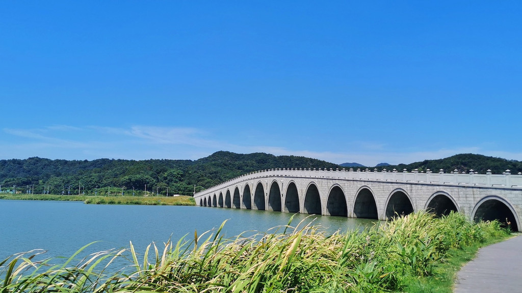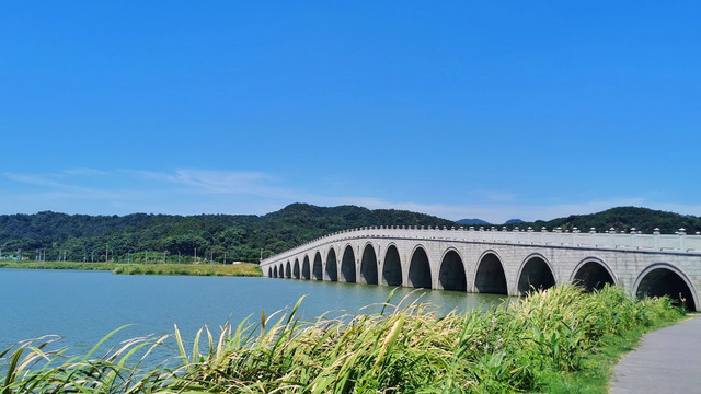 有水的地方就有桥,在皂李湖上修建了一座全长180.34米的十七孔桥,十七孔桥全长180米,宽11米。大家都知道颐和园内有十七孔桥,若长虹卧波,但上虞的十七孔桥却要比颐和园的十七孔桥还要长30米,这座超越了先辈的十七孔桥已然成为皂李湖上一处不可错过的美景。当然皂李湖并不止这一座桥,正对着十七孔桥的地方,有一个仿若江南园林一般的步行公园,驻足湖畔,放眼远眺,湖面浩淼,涟漪纷呈,波光粼粼;登上湖边的小山,皂李湖三面环山,湖光山色,真是别有一番韵味在心间。