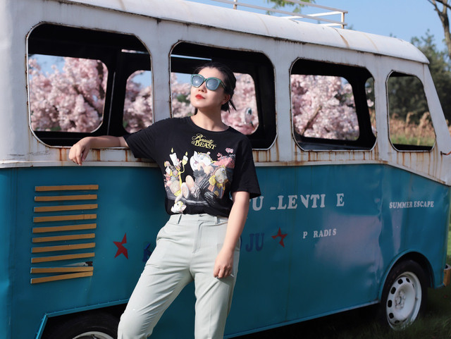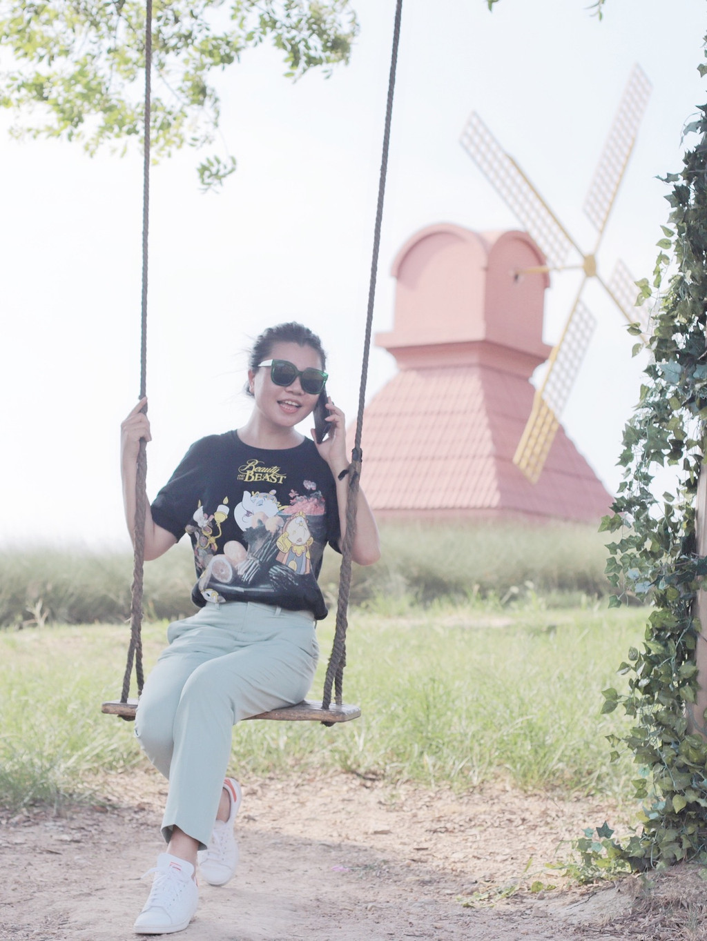 坐完游船深入景区,花海正在茁壮成长中,但景区设置了很多可以供大家拍照的打卡点哦,古董车、荷兰风车、秋千、教堂等等,不但适合拍摄婚纱照,更适合我们这些游客在这里自嗨。