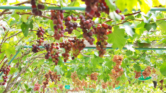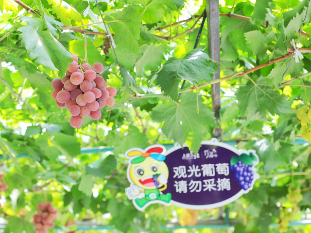 野藤葡萄公园,顾名思义,这里不仅有葡萄可以采摘,它还是一个观光公园。核心观光园区主要由丰富基地、镇东基地、绿翠基地等三大基地组成,在基地里还设有野藤葡萄观光步道、葡萄品种休闲博览长廊等景点。每逢盛夏,跃跃欲试的满园翠色,一望无垠的葡萄长廊,碧叶云天,葡香满园。穿梭在观光步道,头顶上的葡萄个个新鲜在向我们招手,勾引着我们的味觉,好想摘下来马上吃进肚子里。在这里观赏的葡萄挂满藤,所以大家一定不要随便乱摘哦。尽管如此,我们还是品尝到了最新鲜的盖北葡萄,拿起一颗葡萄,只见它晶莹剔透、肉丰汁多,闻着这香味,吃着这一颗一颗的甜蜜蜜,大有“葡萄美酒夜光杯”的感觉。