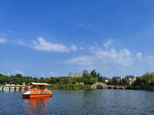 我们来到海上花田的时候,正是炎热的夏季,景区里没有看到万亩花海,但已经在种植培育即将到来的万亩花海了。虽然没有看到鲜花,但踩着脚踏船泛舟湖上也是极好的,虽然太阳很晒,但小船遮阴效果还不错,湖面上的微风很温柔,如果带点水果饮料上来就更美了。