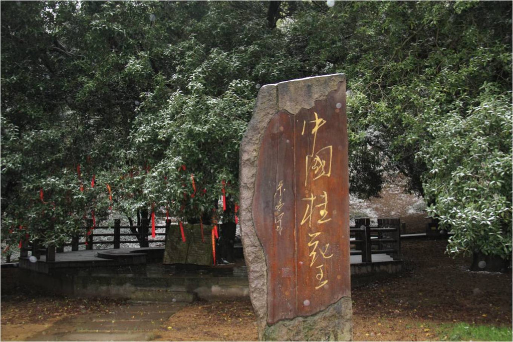 这棵枝繁叶茂的桂花树就是“ 中国 桂花王”,它也是景区的镇园之宝。这棵桂花王由三根主干围城,更特别的是三根主干又分长三根支干。此树高18米,树冠直径20.2米,根基径围4.3米,覆盖面积达320多平方,需4人才能合抱,树龄约为一千年,比 湖北咸宁 ( 中国 五大赏桂地: 湖北咸宁 、 湖南桃源 、江苏苏州 、 广西桂林 )600年树龄的桂花王还要高大、年代还要久远。