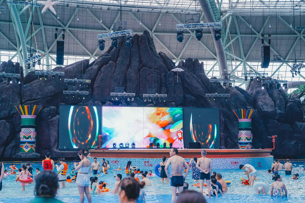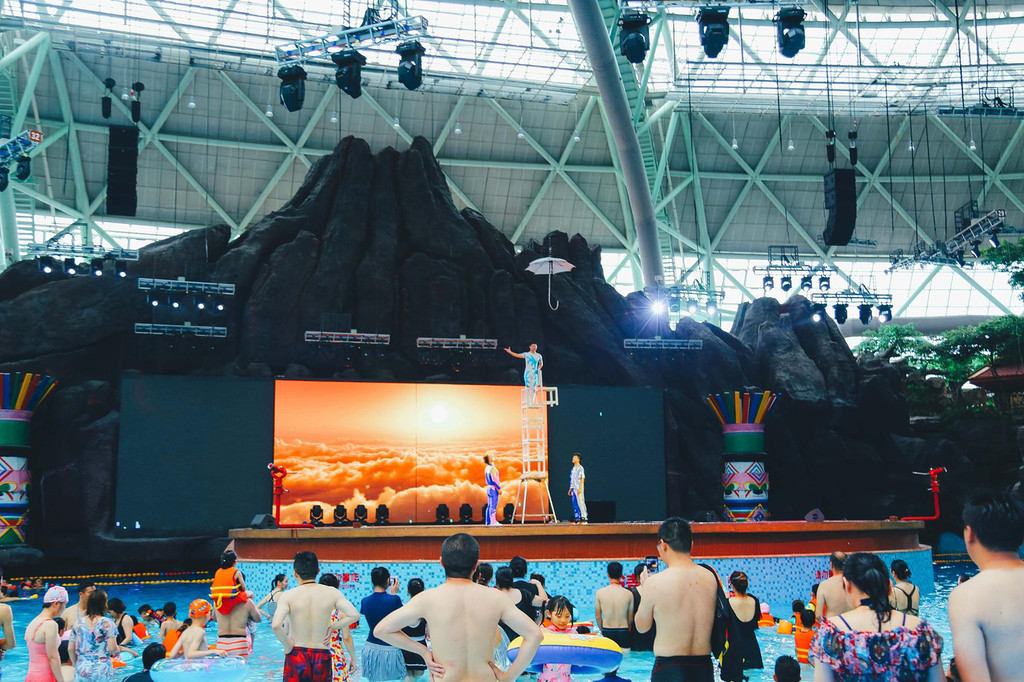 这里有浓浓的海洋气息,在泳池的中间还有一个超大的舞台,不定期会上演舞蹈、杂技、唱歌 等不同的项目,