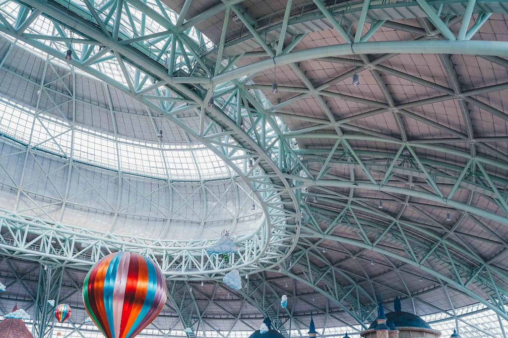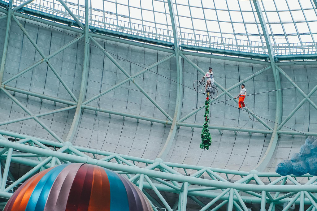 抬头一看,你会发现这个巨型穹顶之上,正在上演超高难度的单车骑行表演,