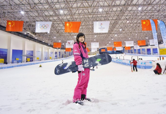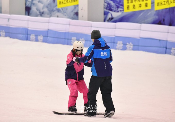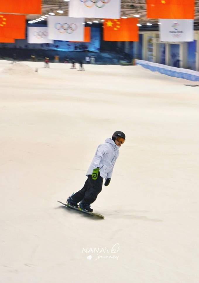 领好滑雪服、鞋子、头盔、手套、板,就可以开始冰雪运动了~雪场一共是两条雪道,右手边的雪道还有障碍可玩自由式滑雪。