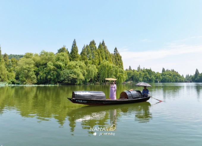 穿上汉服,坐着乌篷船,撑着油纸伞,行于湖中……