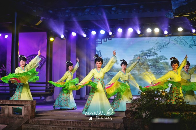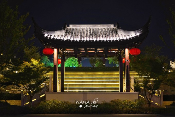 近满月,整个园林在灯光与月光的包裹下,温柔又典雅,走在回廊之中,仿佛来了一场夜晚的时光穿越。
