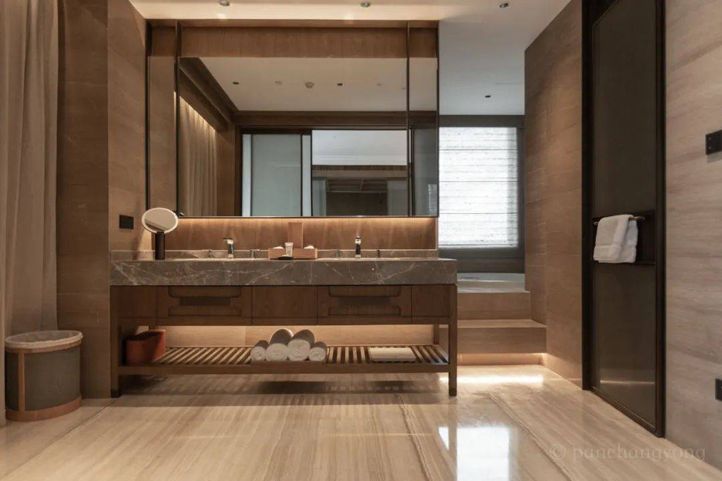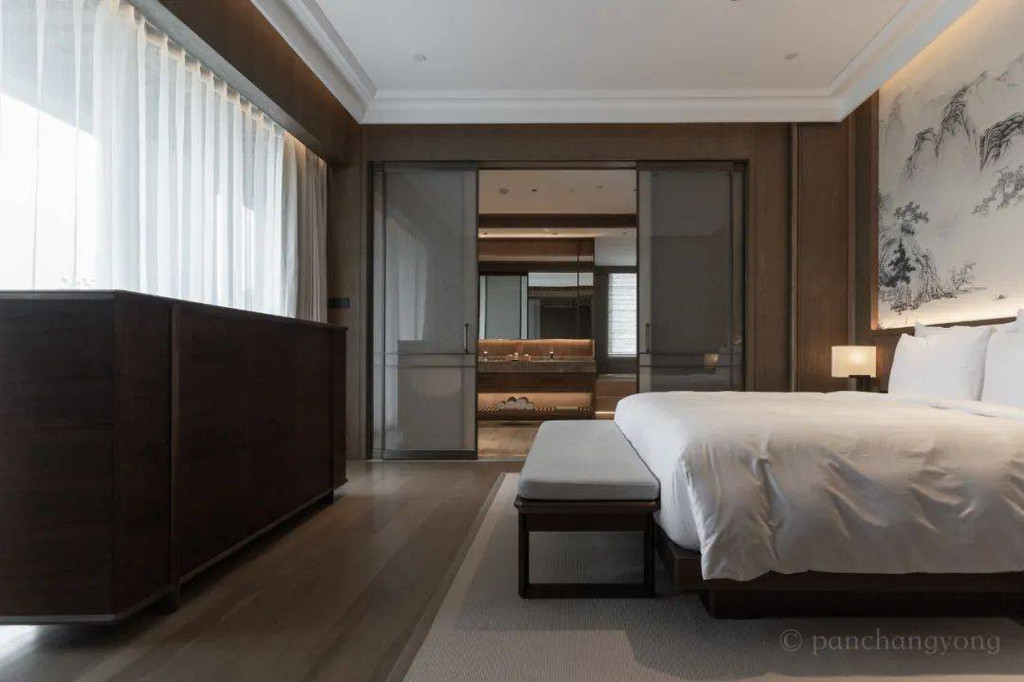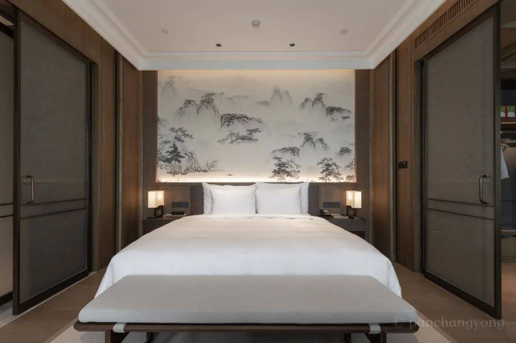 酒店有各式山水客房,一共150套,面积54㎡-300㎡,景观有园林和湖景。简约素雅的中式客房,房型的命名来自《山居赋》,渐榭、照涧、镜澜、隐山,推门即享谢灵运笔下的同款东山的山水仙境。