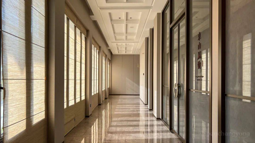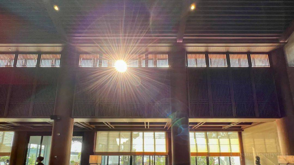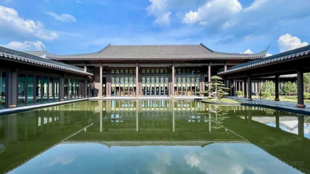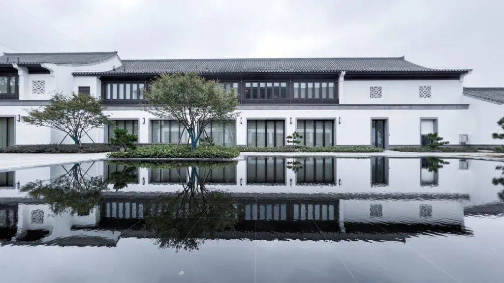 宽敞的长廊上每天不同时间段的光影营造出别样的氛围。庭院的水景倒影出房屋建筑的轮廓,精致典雅,如今这里也是许多宾客喜欢打卡的地方。