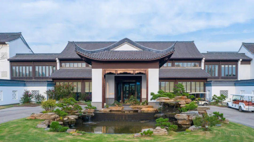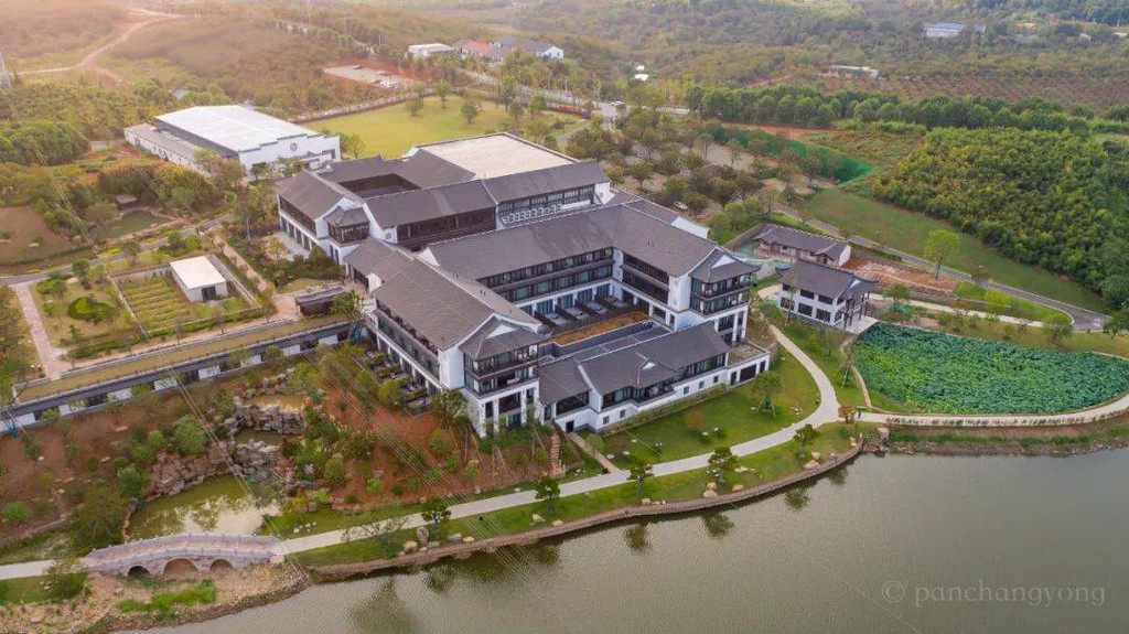 我航拍酒店的时候,依稀可见酒店与周边山川湖泊相融合,古色古香的建筑结构,与自然山水浑然天成;新中式的建筑风格,加上精致的园林与水景,映射出中式建筑的线条之美。