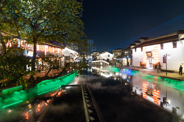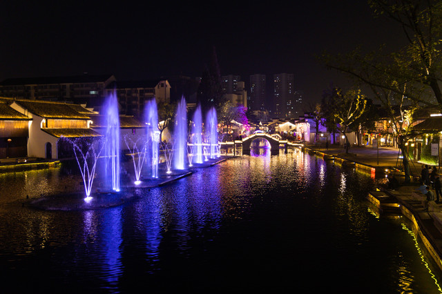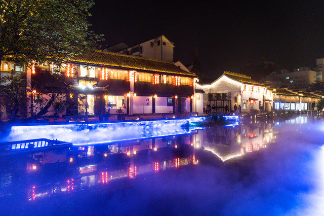 距今已有2000多年历史的柯桥古镇,是浙东古运河沿线重镇,旧称笛里。古镇的柯桥、融光桥、永丰桥,将两条水系划分为四个区域,因此形成了著名的“三桥四水”景观。柯桥古镇的夜景,点亮了柯桥的夜经济。青石板街道上,游客络绎不绝。河道中、石桥下,乌篷船、画舫来回穿梭。整个古镇,披上了景观灯的外衣,还时不时会有仙气飘飘的水雾灯光秀和音乐水秀。在这里,可以沉浸式体验江南水乡的独特韵味。