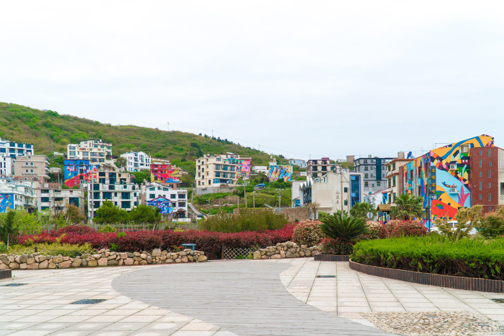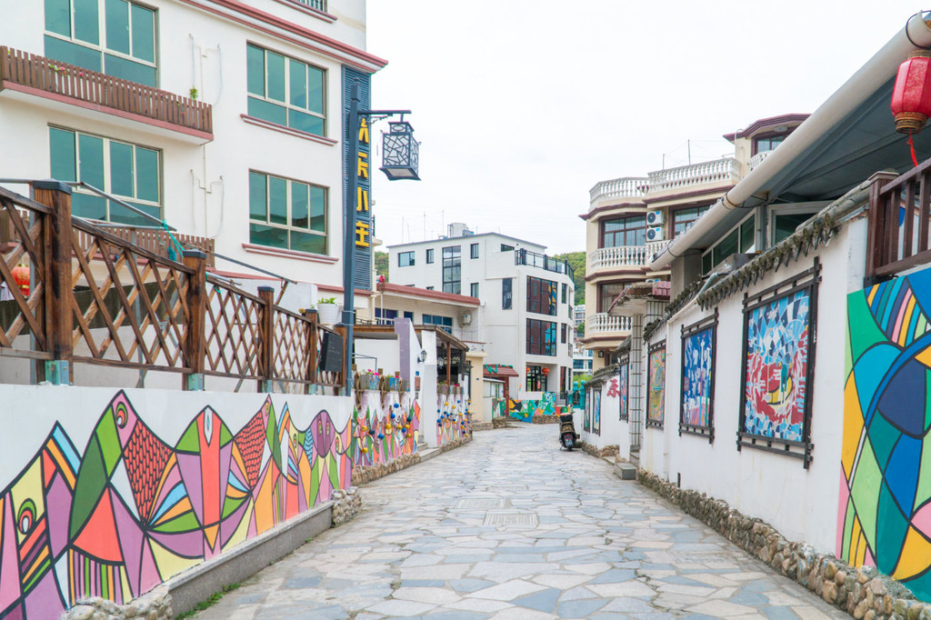 傍晚,来到东海渔村。这里非常有趣!许多村民在自己家的房子墙壁上,涂满了壁画。这里有各式各样的酒店、饭馆、门楼。村子的中心是渔俗广场,中间摆放着一艘大大的渔船。这个渔村人气非常旺,吃喝玩乐一条龙。