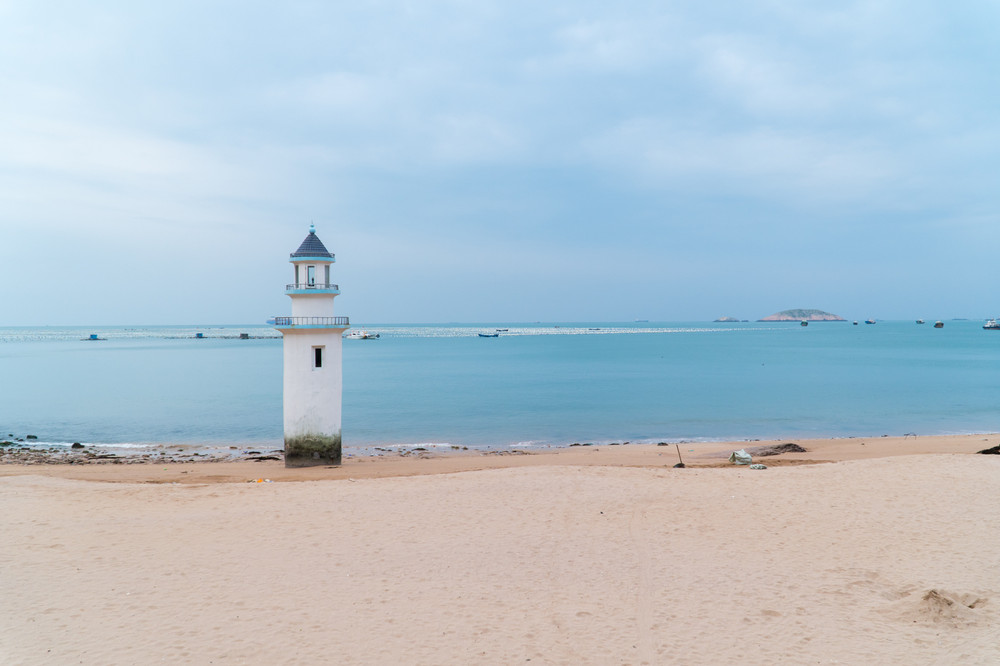 从海上牧场回到花筑·奢呆鱼民宿,民宿的对面就是大玉湾沙滩。大玉湾沙滩非常美,而且相对于南长涂沙滩等大沙滩,它的游客较少,非常适合安静的散步、游走。这个沙滩的沙子,也很柔软。而且这里也有一座灯塔,非常适合拍照。如果你能起早,来到这里,你会感觉像是承包了整个沙滩。当然,傍晚站在礁石上游玩时,要注意涨潮。