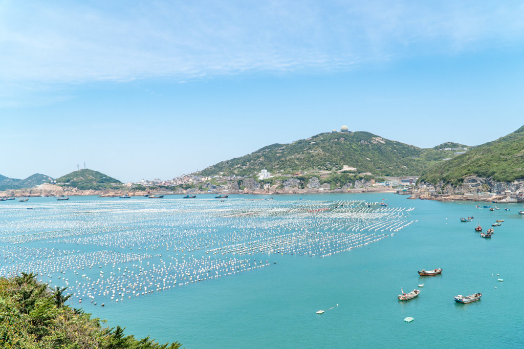 海上牧场,就在东崖绝壁的出口不远处。眺望大海,就可以看到成片整齐排列的漂浮白球,那是养殖贻贝的浮球。渔船在浮球间穿梭作业,特别是夕阳西下的时候,更有意境。
