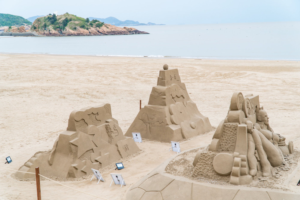 坐船来到泗礁本岛,到小巷里民宿办理入住后。出门5分钟,便是南长涂沙滩。沙滩上,现在有许多沙雕。平时这里非常热闹,水上运动、踩沙滩,游客众多。