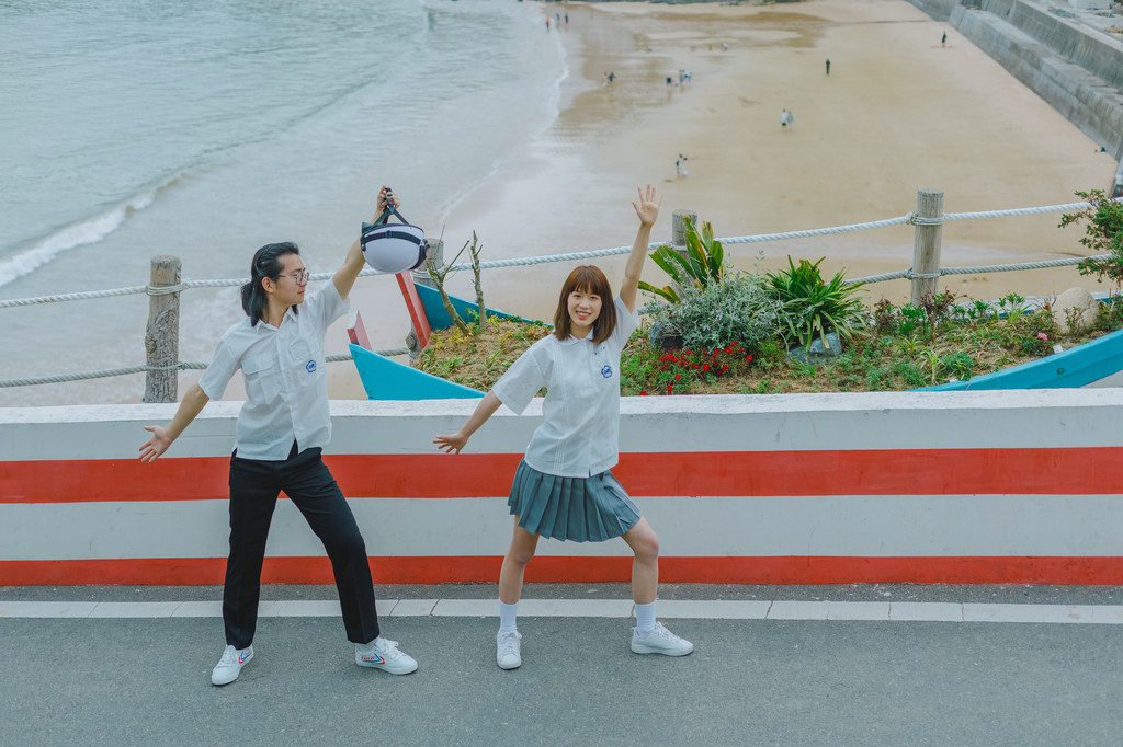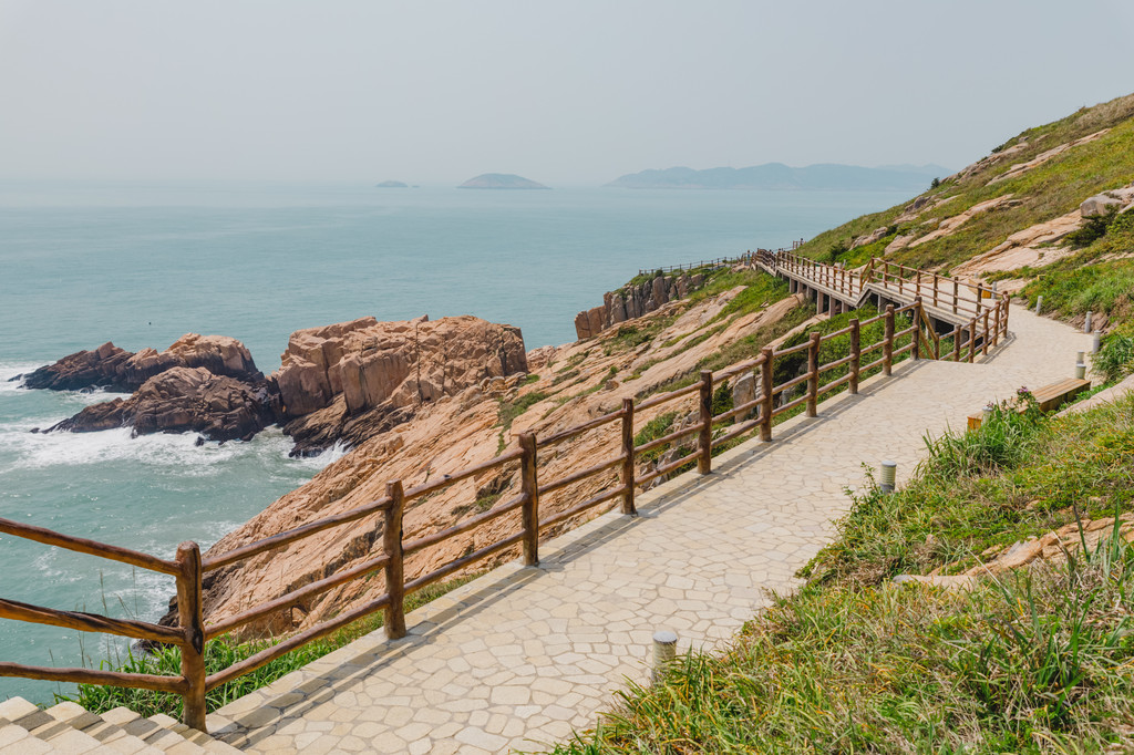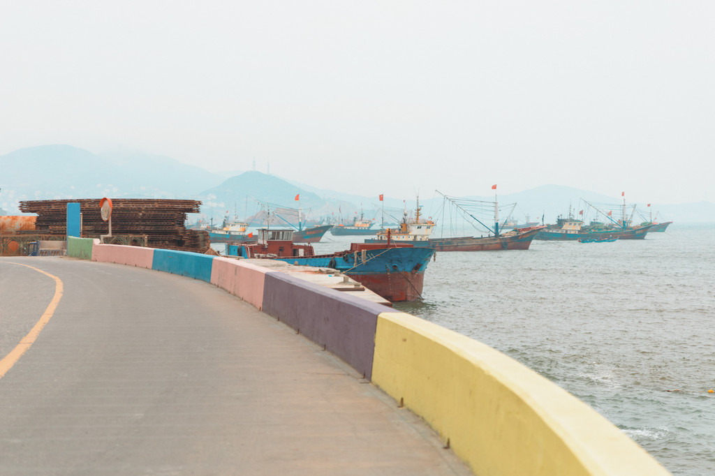枸杞岛的整条环海公路被称作彩虹公路,因为路堤被漆成了彩色,很适合拍照。彩虹公路适合边逛边拍,发现一些隐藏的拍照机位。比如从大王沙滩朝着嵊山岛的方向走,有一个彩虹阶梯,我们是路过的时候看到的,但是我们没去。