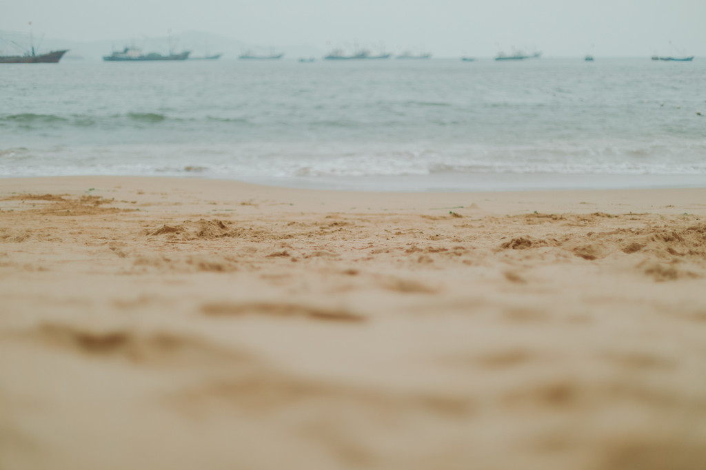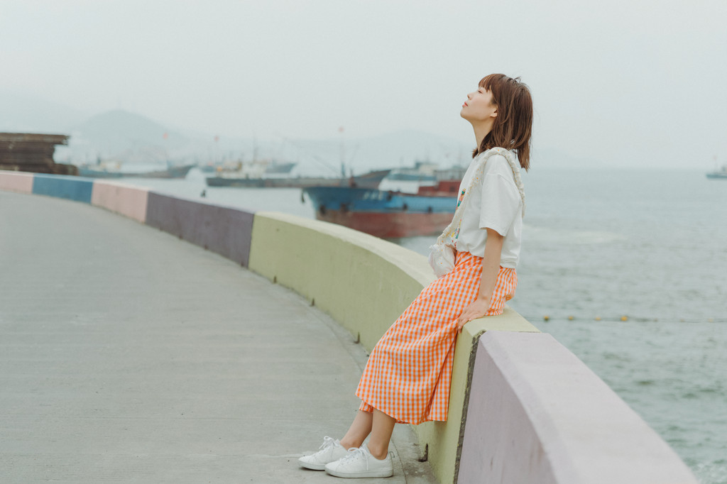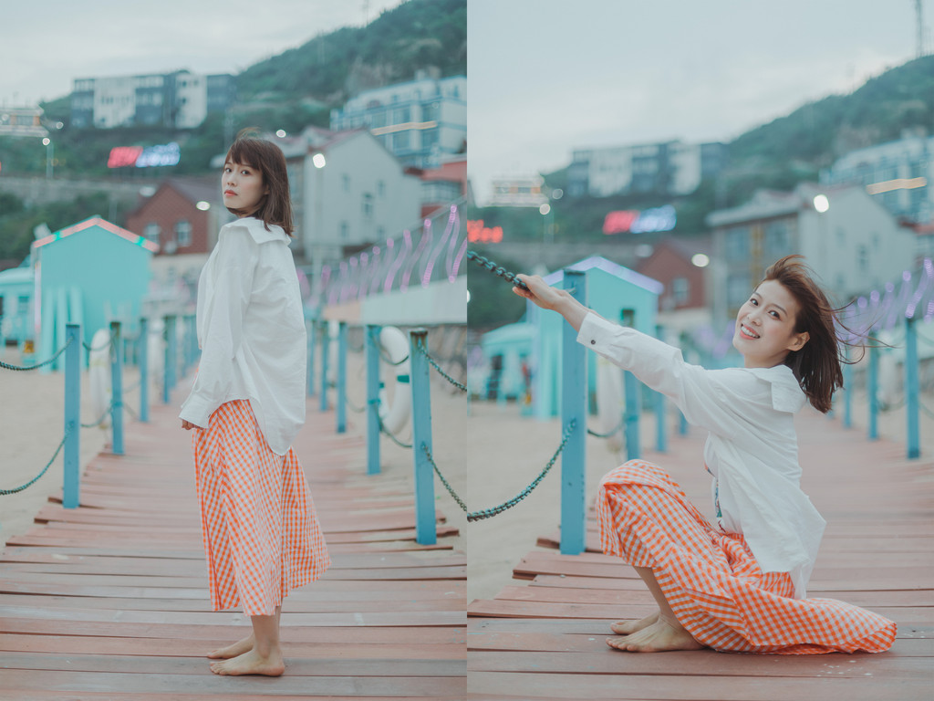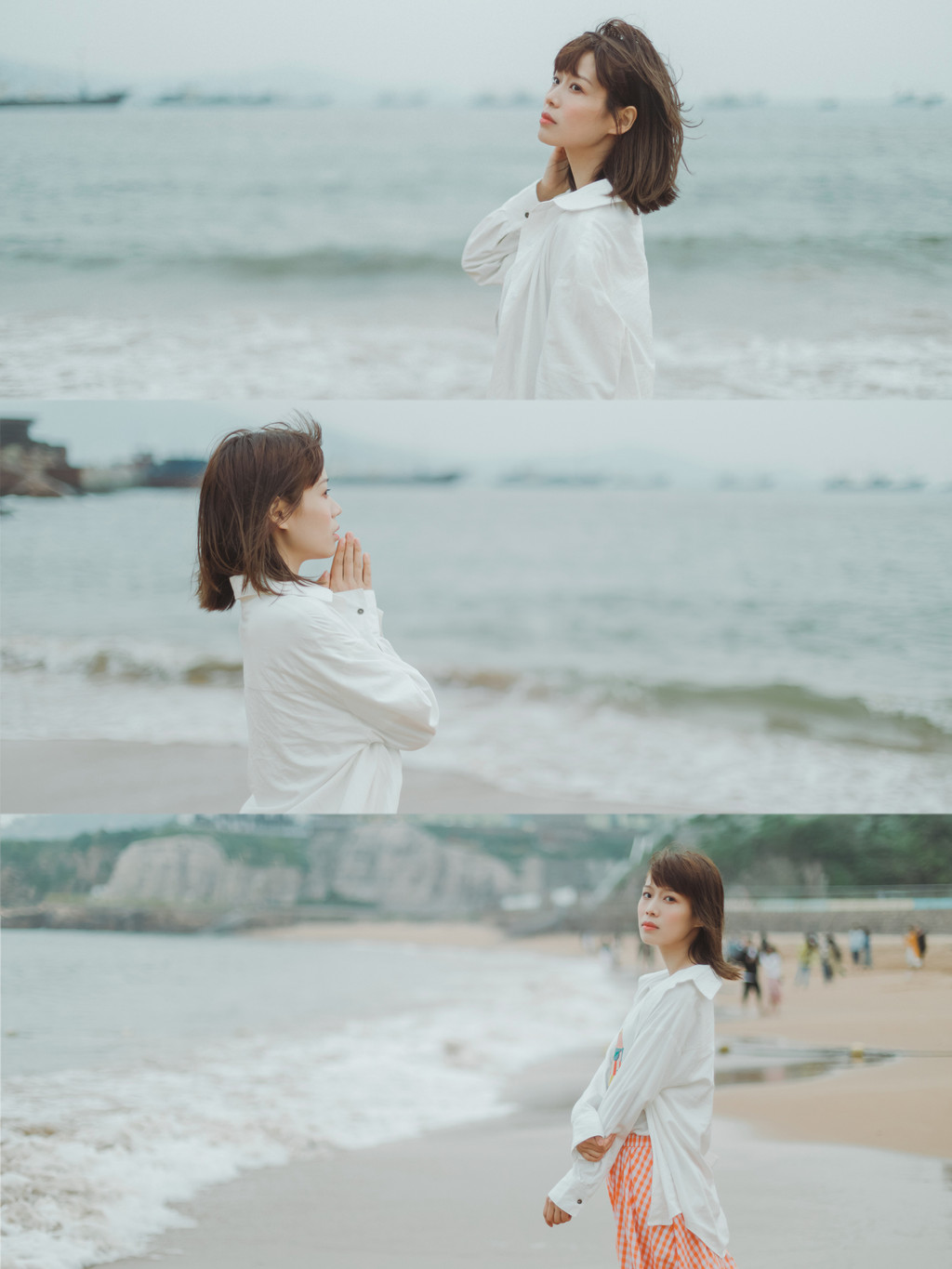 【拍照建议】:阴天的沙滩特别适合拍情绪人像,摆出忧郁的表情,看着远方,看着海。低头、理头发、蹲着、拍背影,情绪片不需要很大的动作幅度。