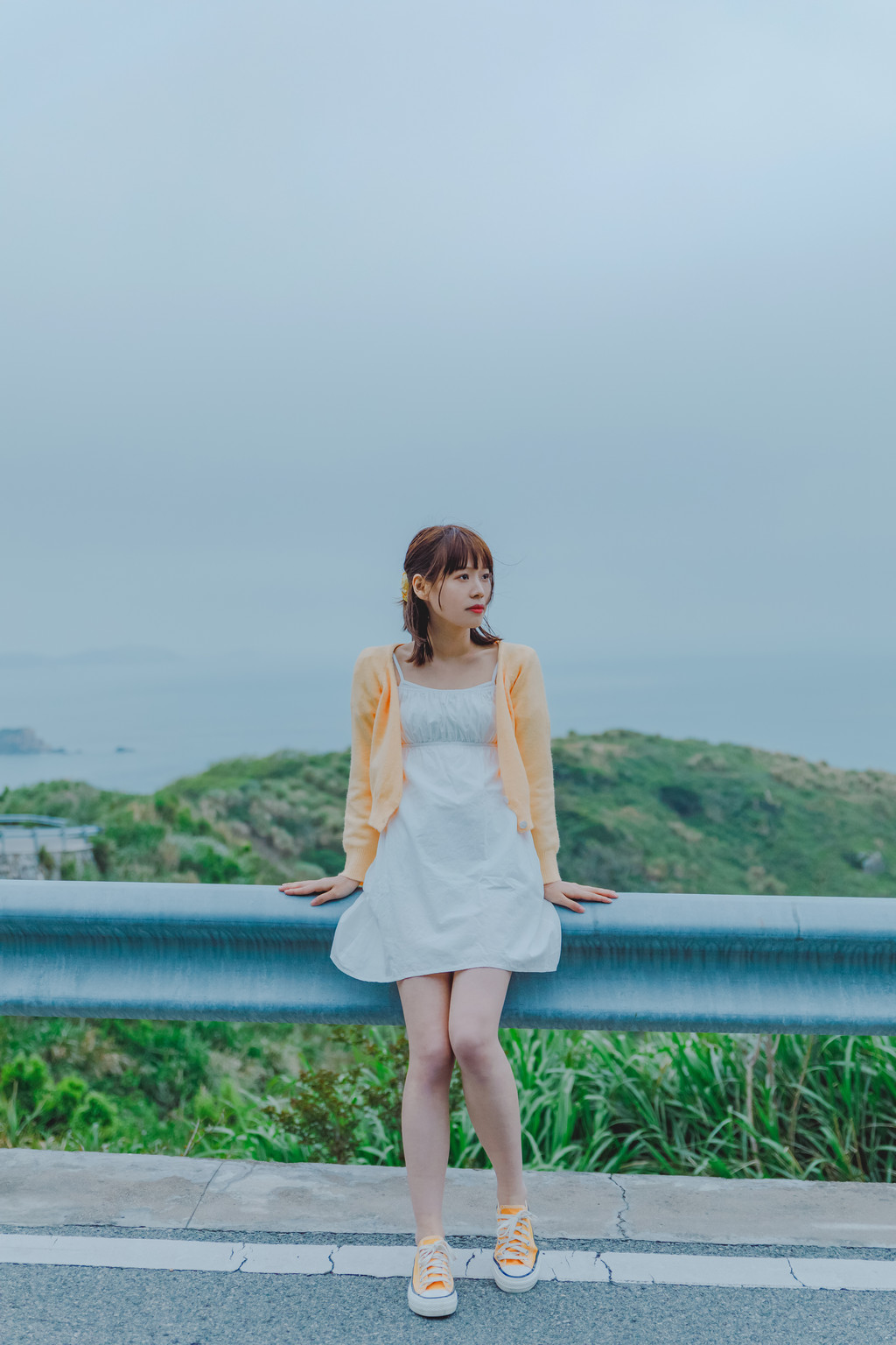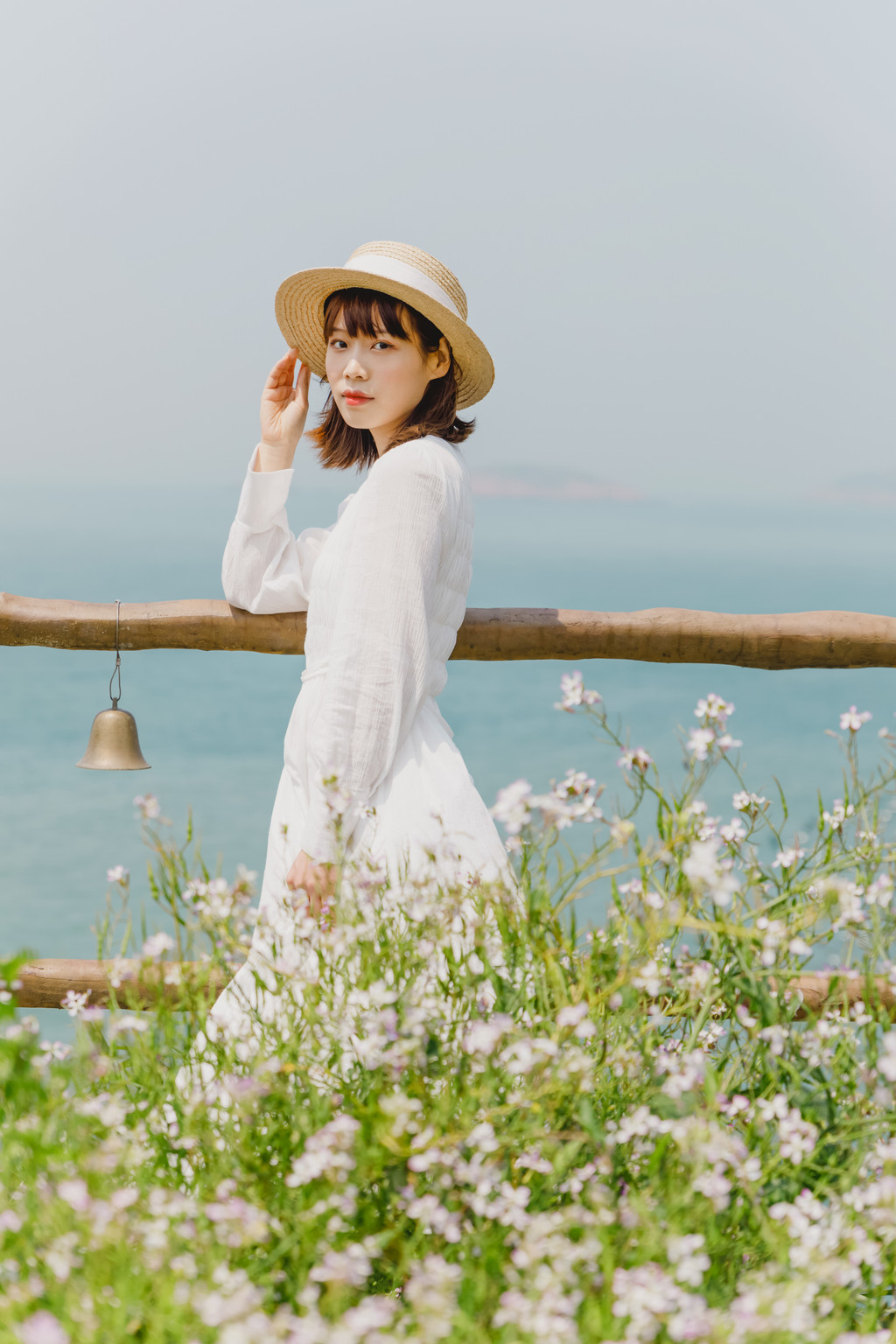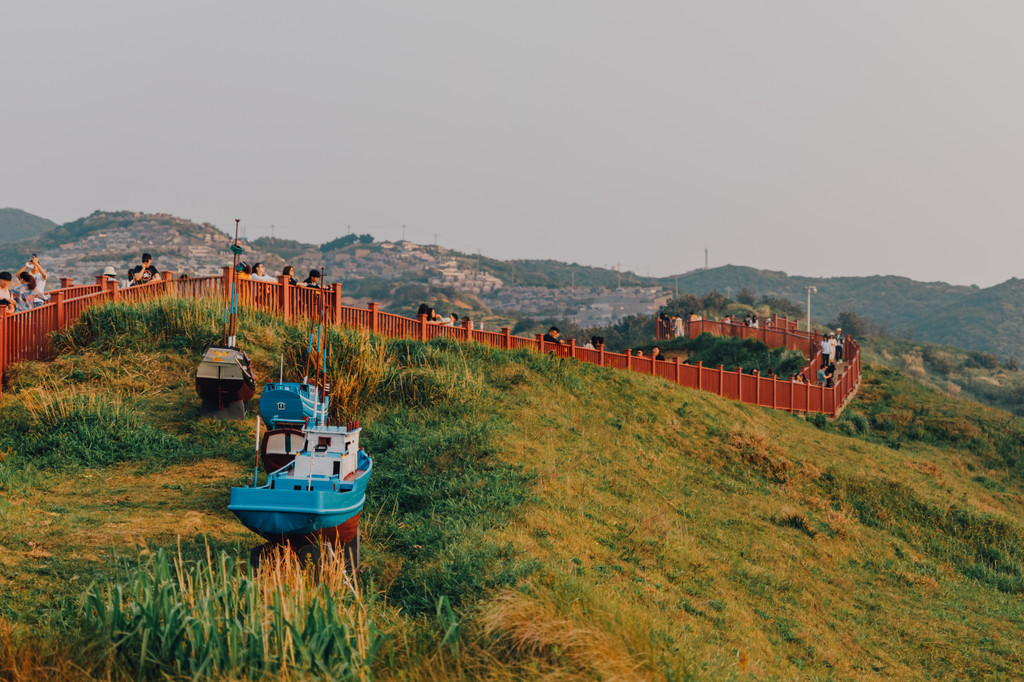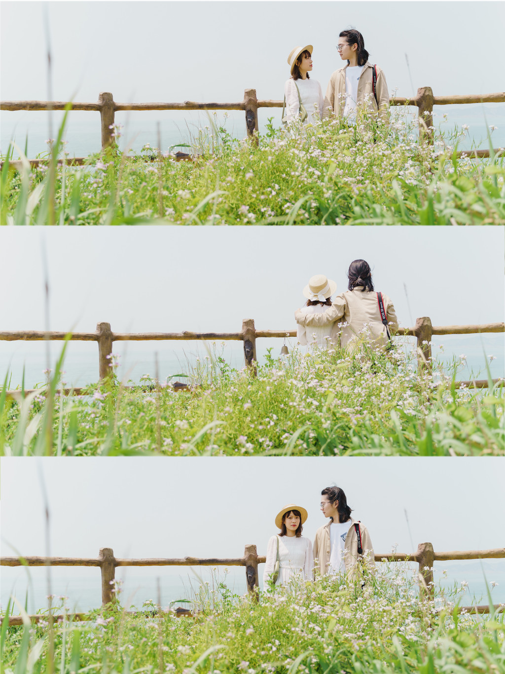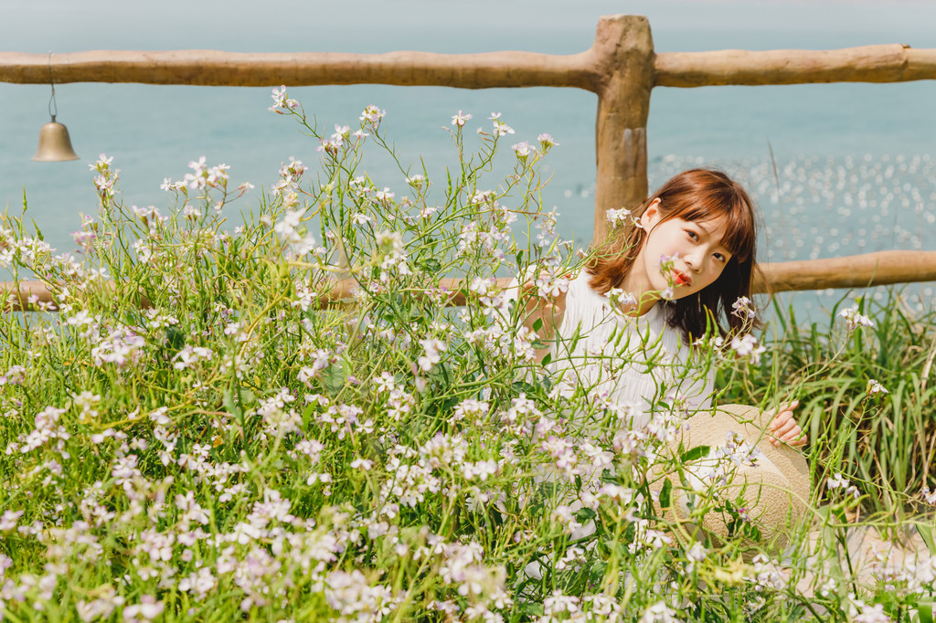 【拍照建议】:走到接近大王沙滩和山海奇观中间的这一段彩虹公路,非常好拍,因为背景正好是一片海上牧场,还有几只零星的渔船。路边有一小撮萝卜花丛,可以摘一朵小野花当道具,戴在耳朵边上,闭眼闻花,拿野花当前景拍照。