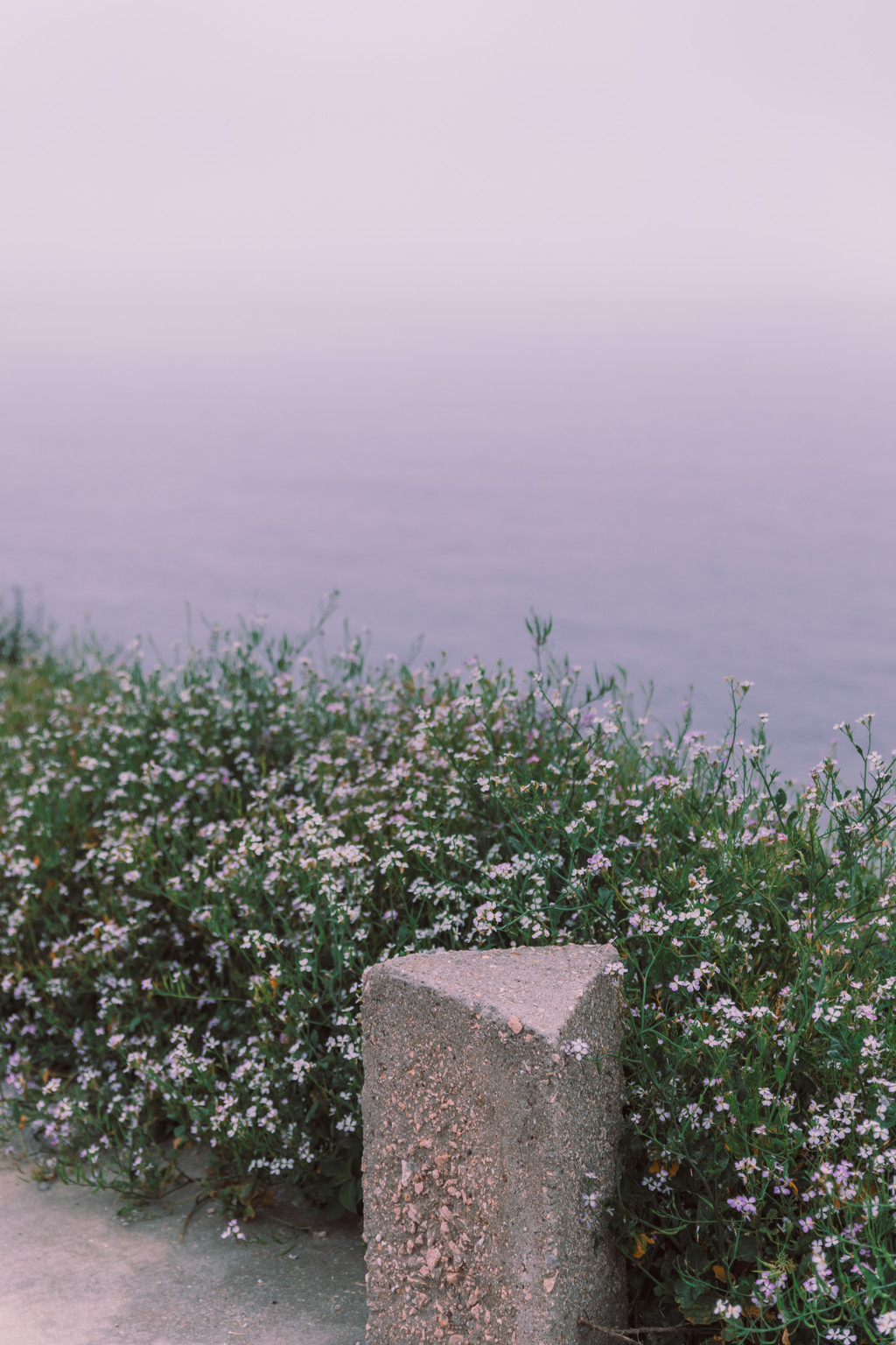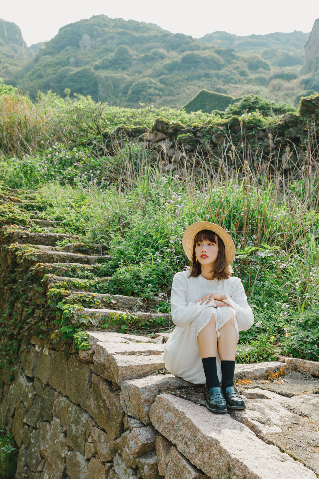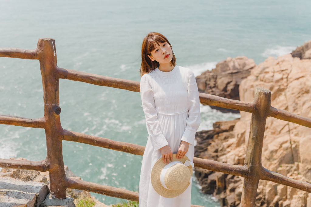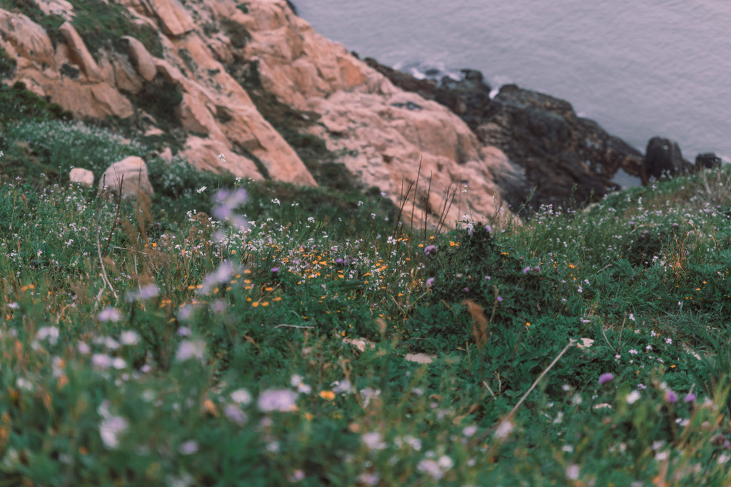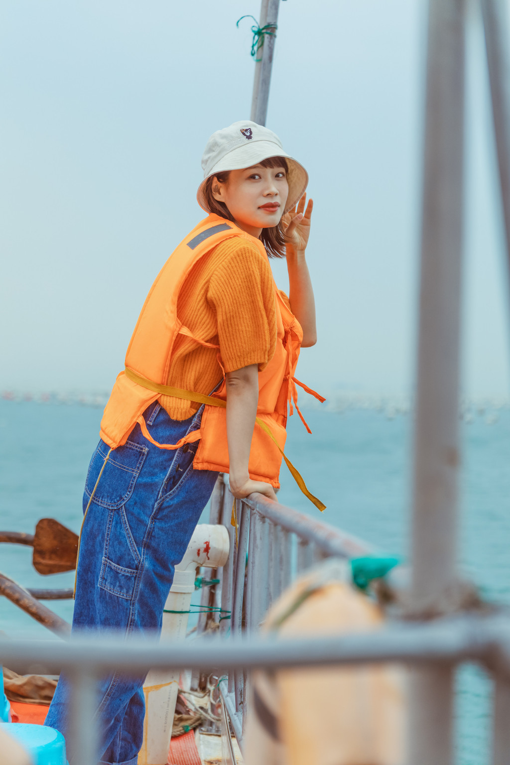 【拍照建议】:走到接近大王沙滩和山海奇观中间的这一段彩虹公路,非常好拍,因为背景正好是一片海上牧场,还有几只零星的渔船。路边有一小撮萝卜花丛,可以摘一朵小野花当道具,戴在耳朵边上,闭眼闻花,拿野花当前景拍照。