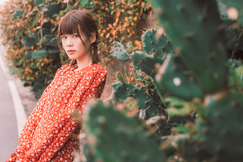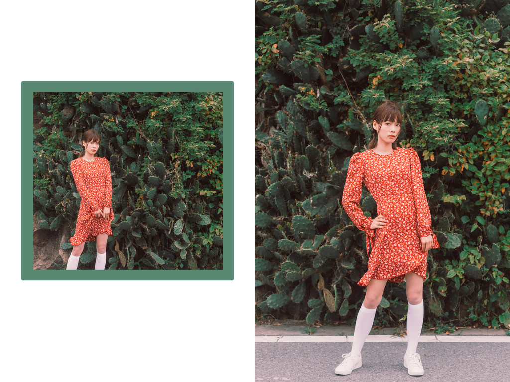 我今天穿了一条红色碎花裙,后期调成了复古一点的风格。与仙人掌互动的时候小心刺和蜘蛛网。人可以分别站在仙人掌前面或者旁边拍照。