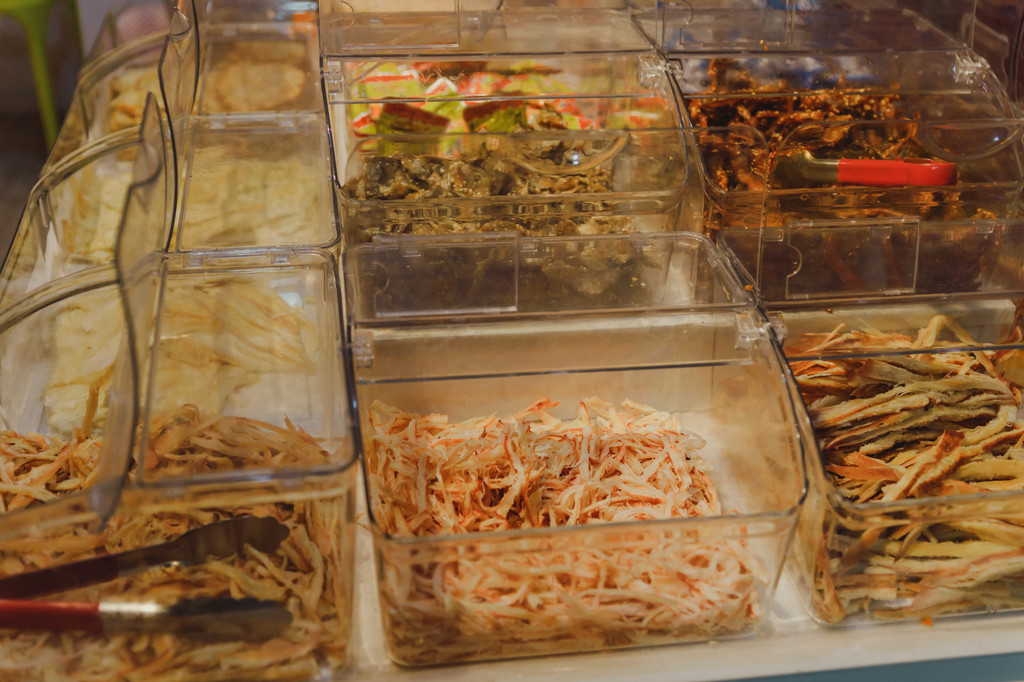 路过一家零食店,被现烤的鱼香味吸引,店家特别热情,每一种鱿鱼丝和鱼干都给我们试吃了,都很好吃。